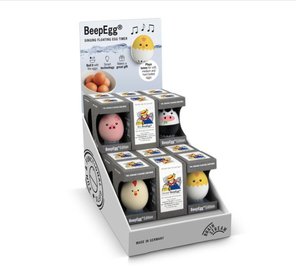 BeepEgg® constantly measures the outer temperature. With this data it calculates the core temperature of the egg. BeepEgg knows at which temperature each stage is perfect. Once the egg has reached the way you like it (soft, medium or hard) a melody will play.