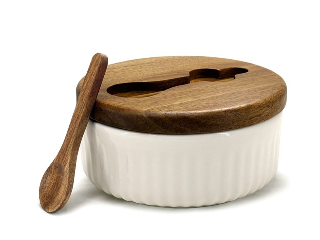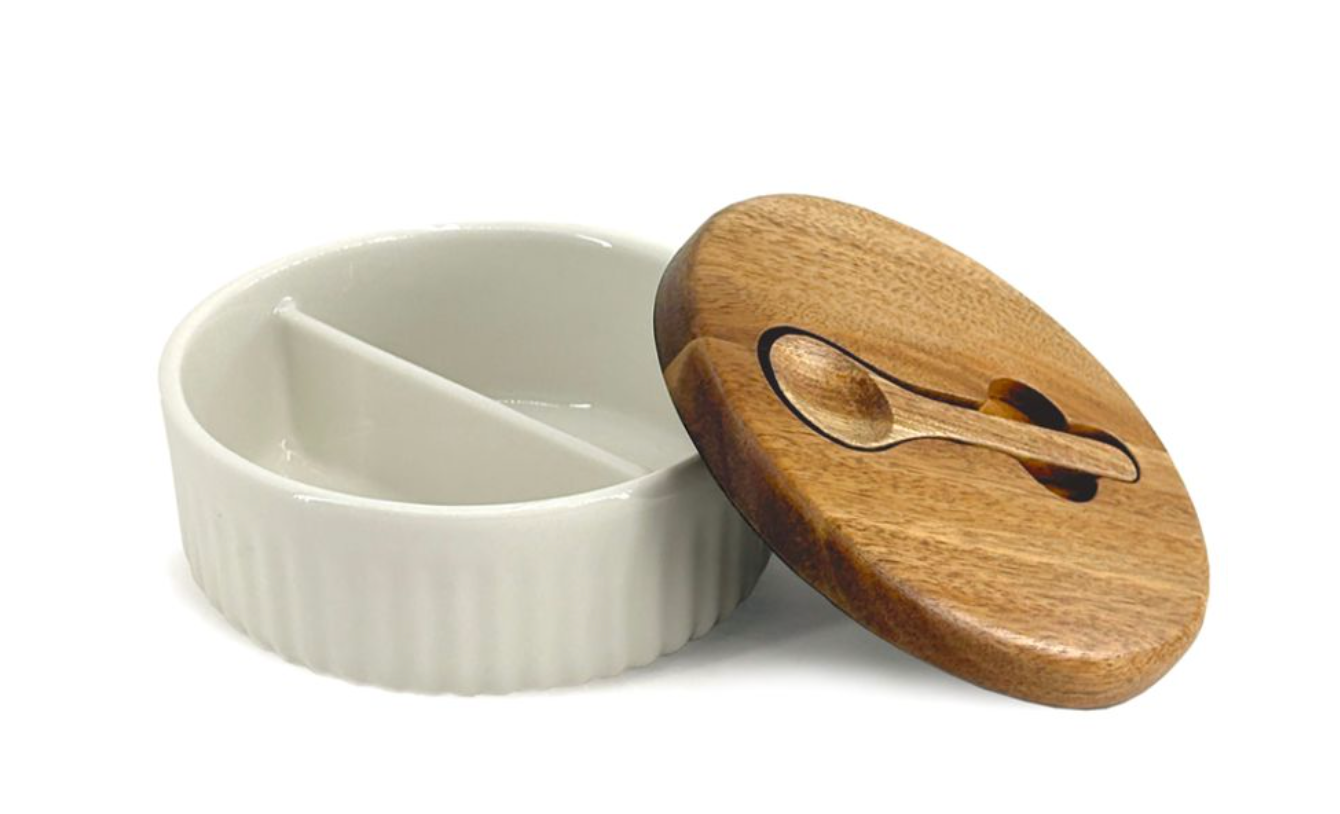 Divided Salt Keeper, porcelain with acacia spoon and lid. Conveniently keeps salt, spices or dried herbs separate in one pot and at your fingertips. Acacia spoon nests into lid for convenient storage. Read more