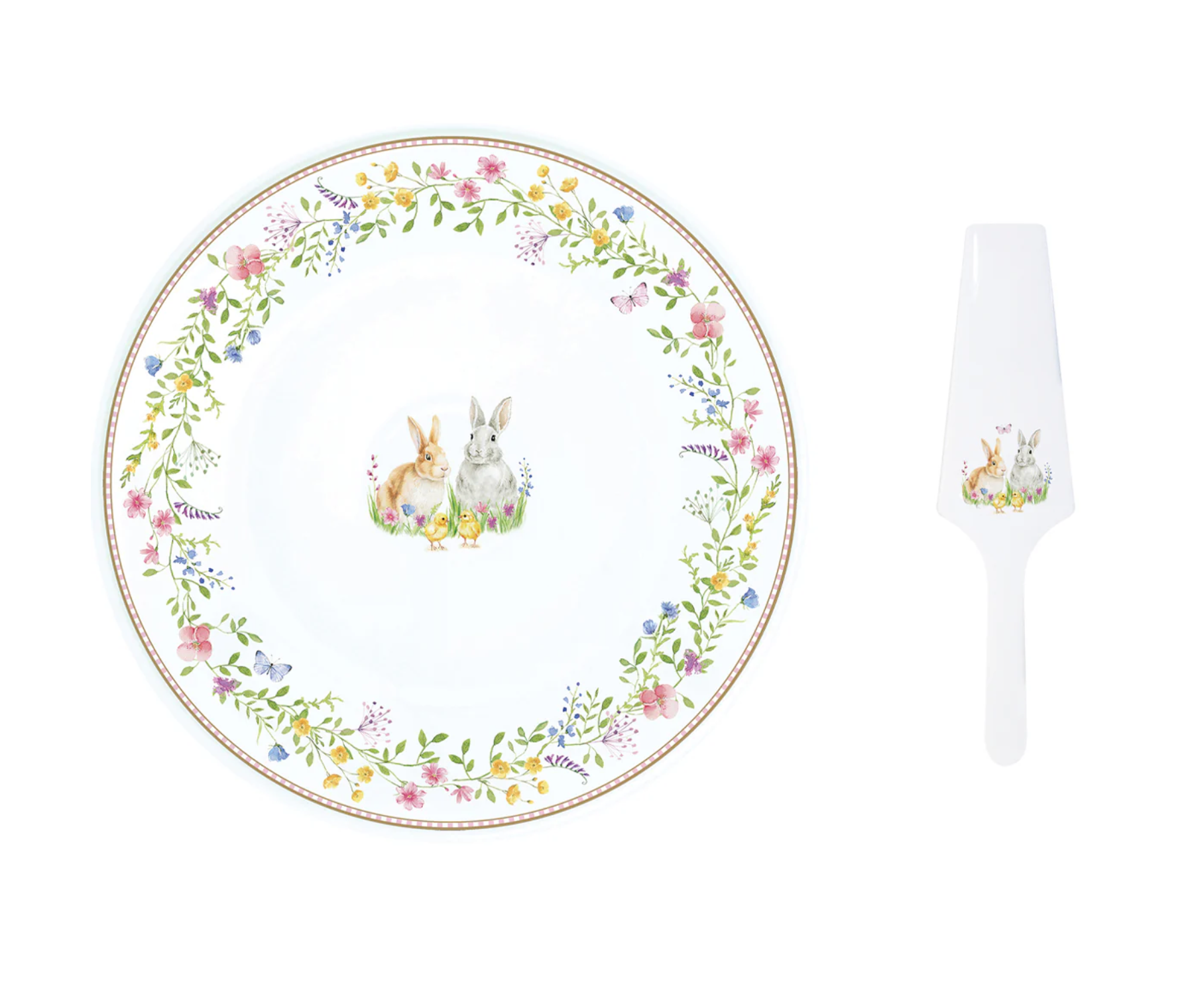 Happy Easter Cake Plate with Server, featuring two adorable bunnies and floral decor.