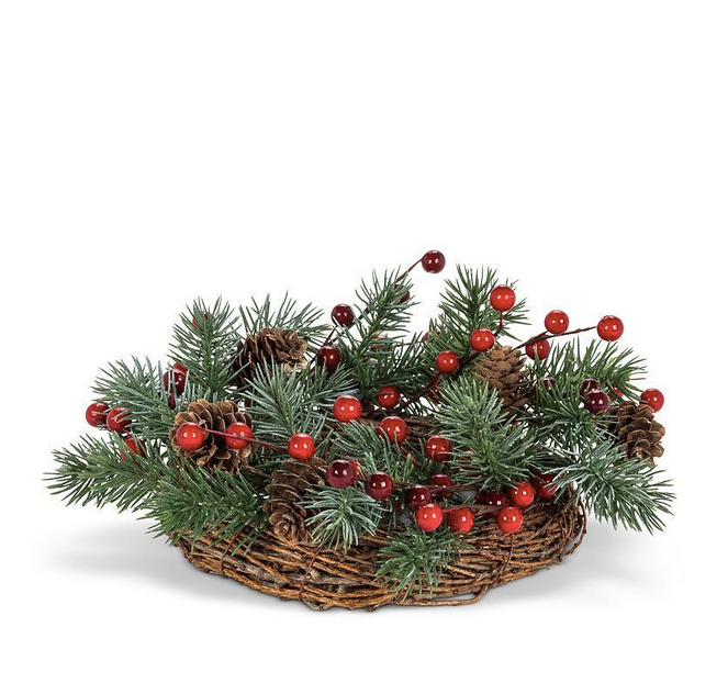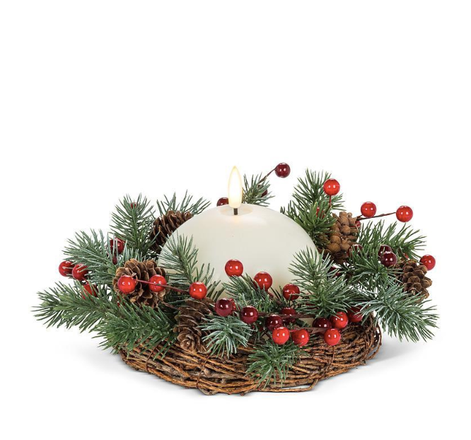 Bring some festive flair to any space with this Fir & Berry Candle Ring. Crafted out of plastic and natural materials, this ring made up of life-like, snow-frosted pine and berry sprigs around a circular ring of branches makes a understated complement to circular candles and mantle, counters, decorative displays and more.