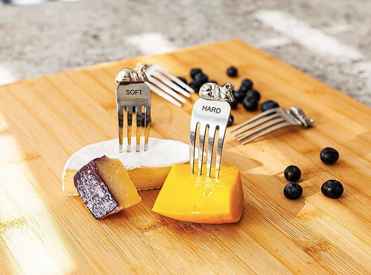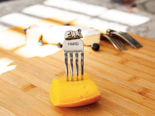 Complement any wine and cheese tasting with the help of this set of 4 Mouse-themed Cheese Markers. Crafted out of stainless steel and brass, each marker includes a description (soft, hard, sharp, mild) – accented with a playful mouse decoration at top to enhance any charcuterie board.