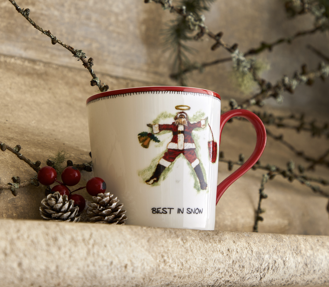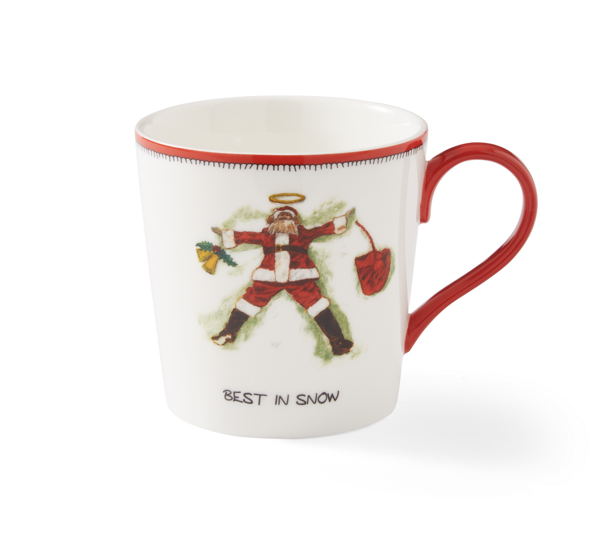 Make someone smile with this colourful mug from the Kit Kemp Christmas Doodles collection. Featuring a whimsical illustrated Santa making snow angels in festive jubilation with the tagline ‘Best In Snow’ this fine china mug brings festive cheer no matter what you are sipping. Finished with a cherry-red colored rim and matching handle, this mug is a perfect gift for anyone on your list. Illustrated by Willow Kemp exclusively for Spode.