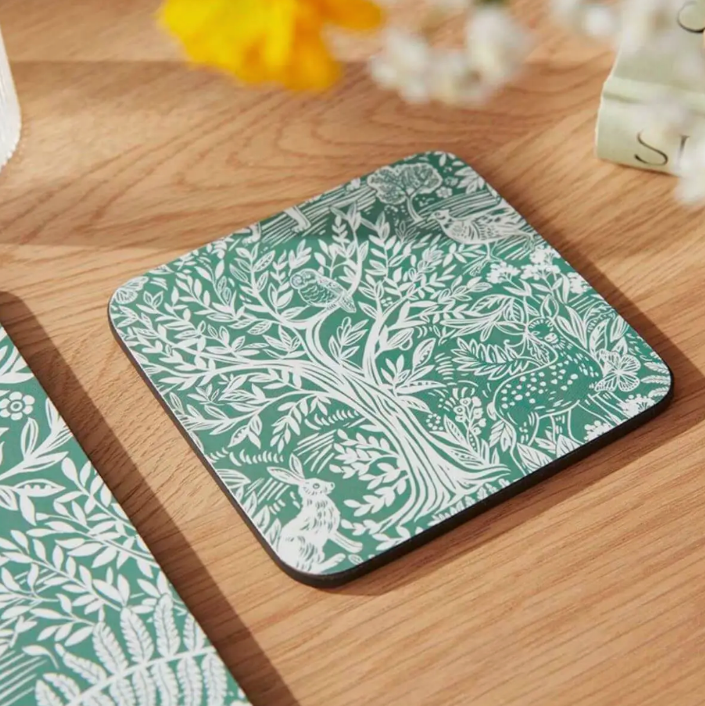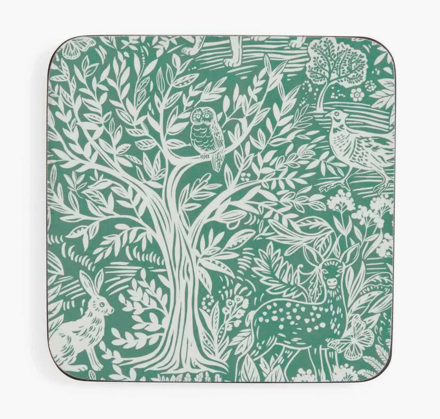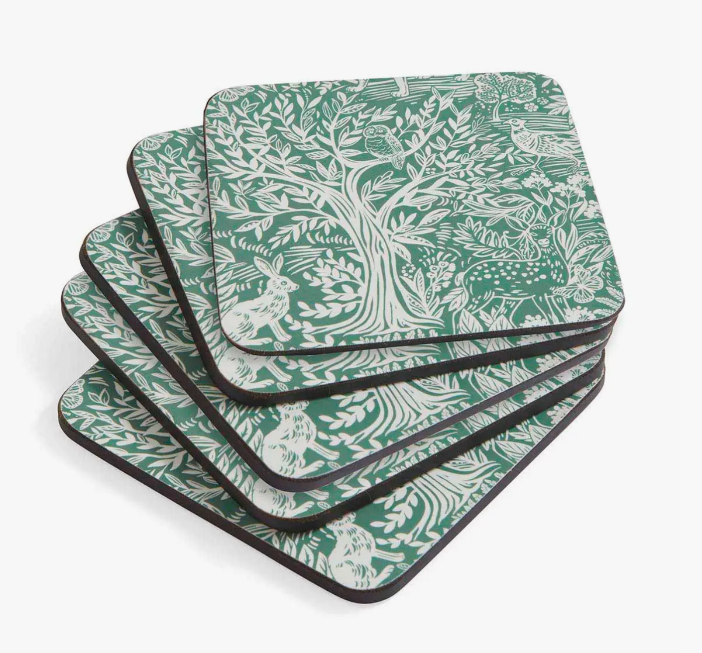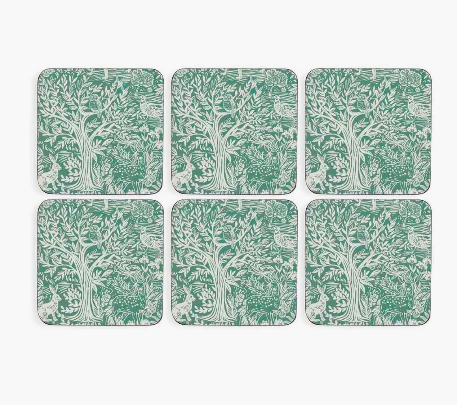 Enchant your guests with these charming Tapestry Sage coasters. Each piece in this set of six features a subtle sage green pattern, which comes alive with intricately illustrated woodland creatures and botanicals. The more you look, the more you see. Made to last, each coaster has been carefully crafted from thick board and finished with a hardwearing cork back. Sealed to ensure heat and stain resistance, keep this set looking lovely by wiping down after use. If you love a natural theme, add a set of matching placemats and create a tapestry tablescape.