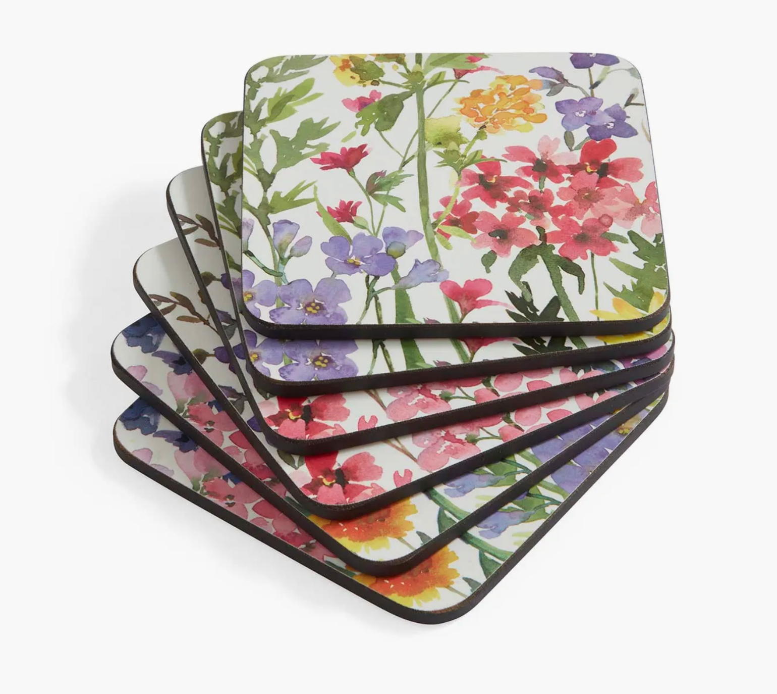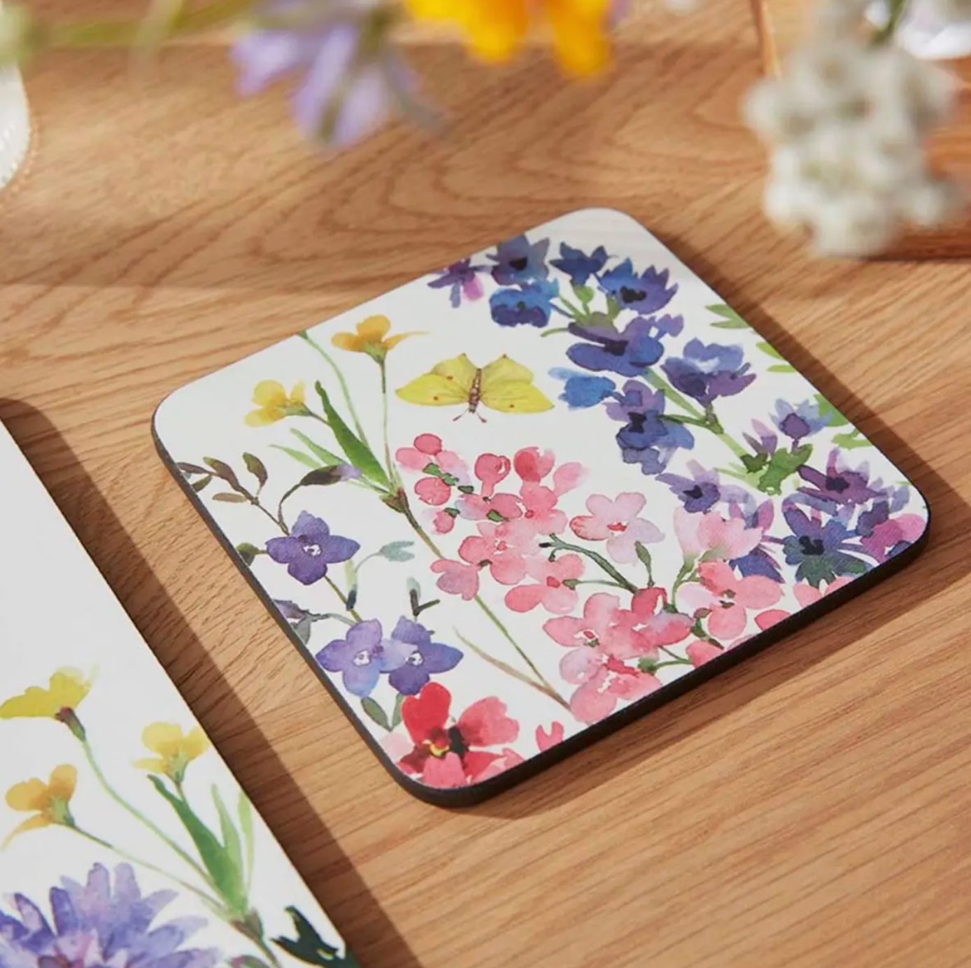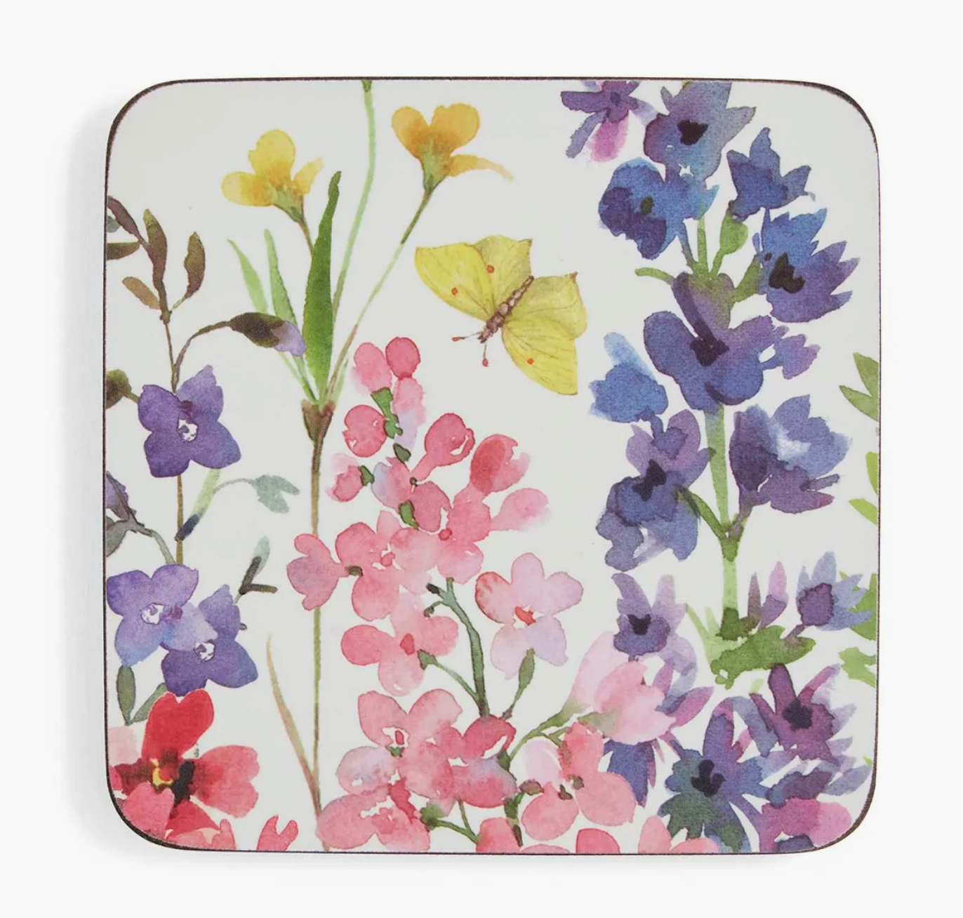 Celebrate the beauty of nature with this set of six Wildflowers coasters. Bursting with colour and life, each coaster features a striking watercolour illustration of wildflowers, delicate butterflies and a vibrant dragonfly. Fabricated from the finest quality, 5mm board, expertly sealed and finished with a hardwearing cork back to protect precious furniture, each coaster in this beautiful set is heat proof, stain resistant and very easy to clean. Go wild and add a matching set of large or medium placemats for a tablescape that’s filled with flowers.