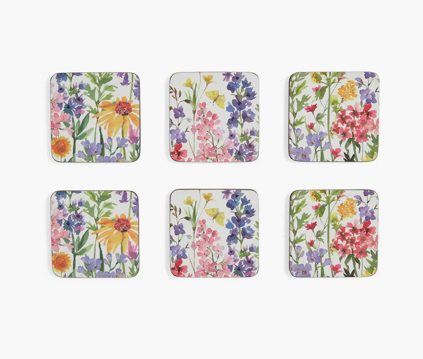 Celebrate the beauty of nature with this set of six Wildflowers coasters. Bursting with colour and life, each coaster features a striking watercolour illustration of wildflowers, delicate butterflies and a vibrant dragonfly. Fabricated from the finest qua Read more