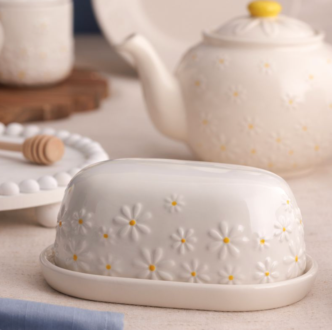 This playful butter dish is made from quality ceramic and features a pretty petal embossment finished with a soft cream glaze and radiant yellow hand paint centre. The Daisy butter dish is part of a fully co-ordinating Daisy collection, including ceramic storage and ceramic table top accessories.