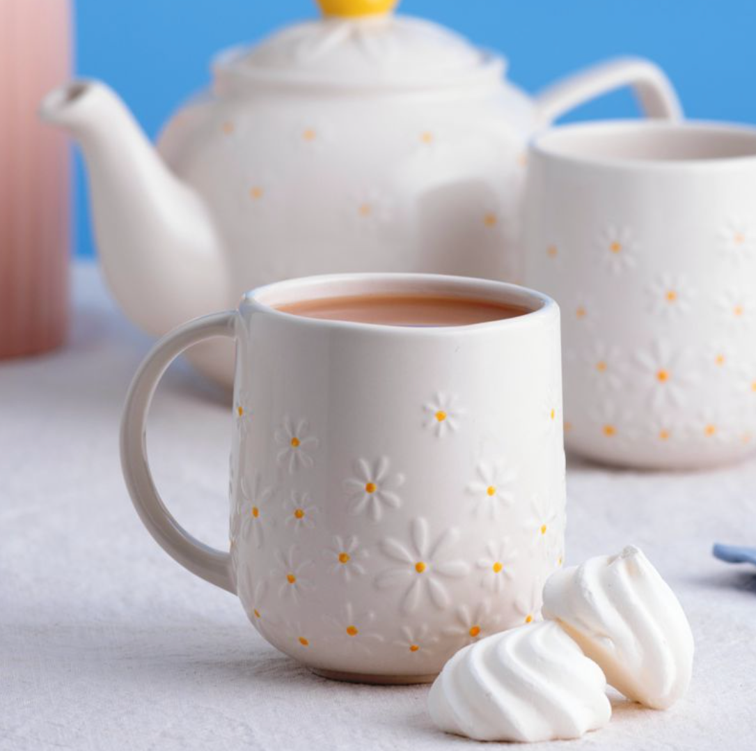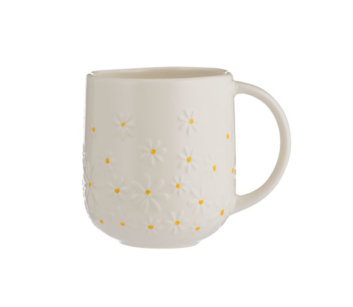 The Price & Kensington Daisy Mug features a white glaze with whimsical daisy embossments, finished with delicate hand painted yellow centres. Made from fine stoneware, the mug is perfect for enjoying hot beverages and has a 360ml capacity.