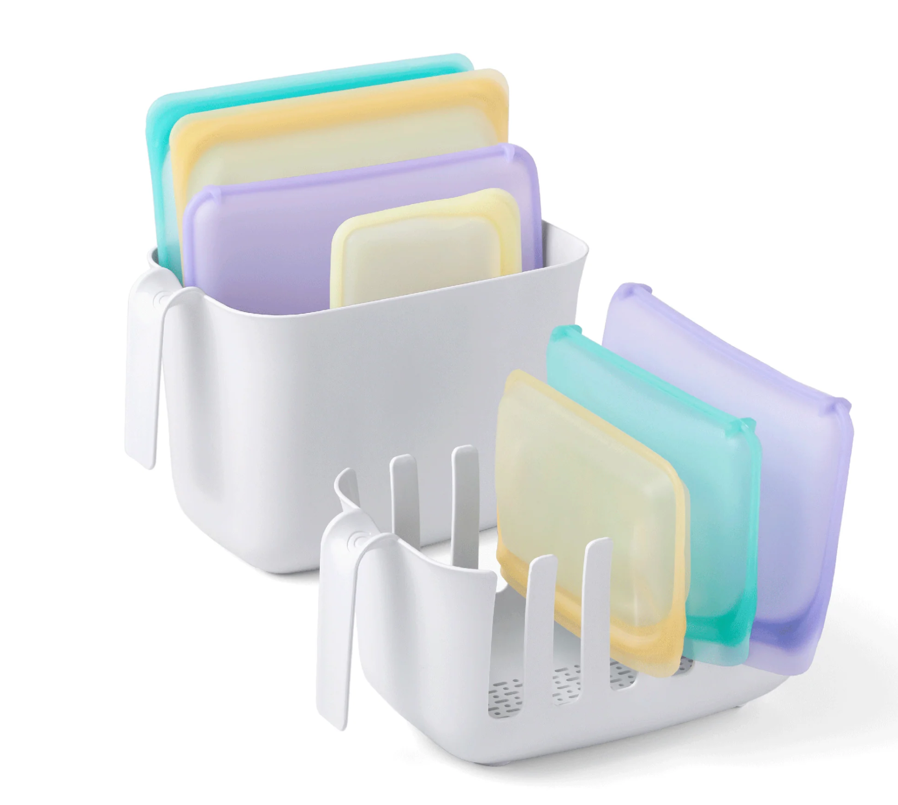 Dry+Store™ Bag Drying Rack and Bin Set provides a simple solution for drying and storing reusable food bags. The drying rack features wide prongs to keep bags open and a vented bottom for maximum airflow. When bags are dry, simply toss them in the storage bin, nest bins together, and store it all in the cabinet for an easy, eco-friendly win.