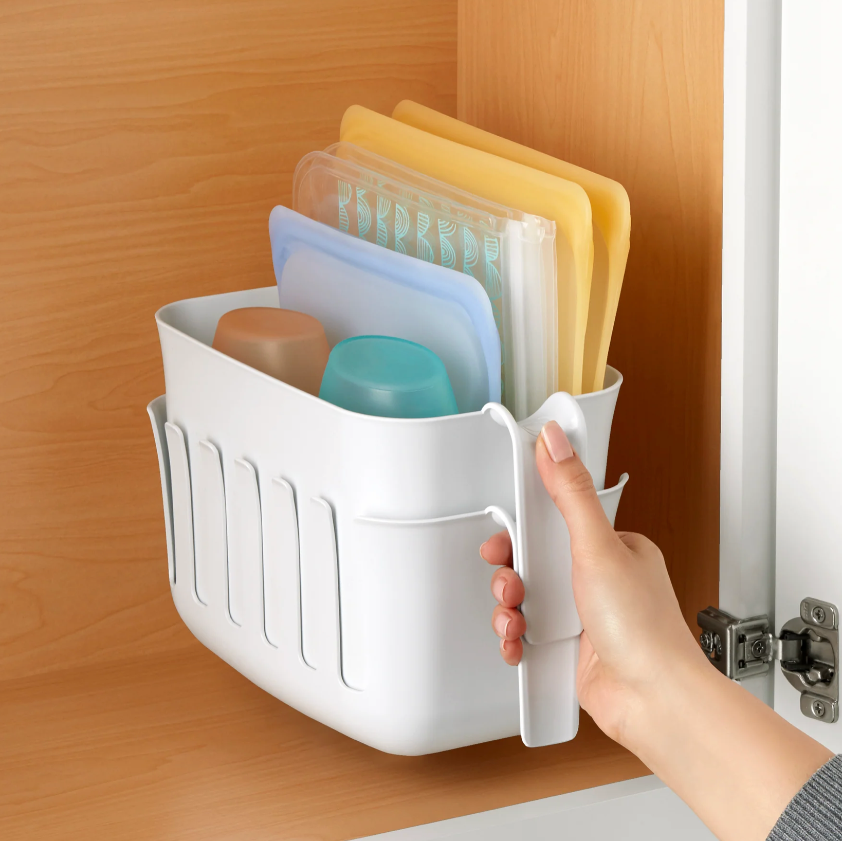 - When bags are dry, simply toss them in the bin and store in the cabinet. The Drying Rack and Storage Bin nest together for compact storage.