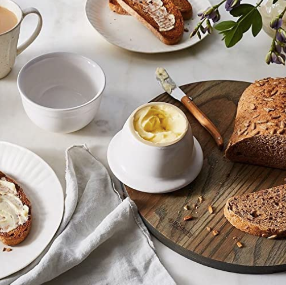 On hand in most European kitchens, the Emile Henry Butter Pot keeps butter fresh and spreadable. Its watertight technology keeps food odors out and your butter fresh for days. Enjoy soft spreadable butter from a traditional French-style ‘beurrier’. Pack butter into the lid, pour ½ inch of cold water into the base, and leave at room temperature. The butter’s flavor and freshness are protected by this airtight seal for up to 30 days without refrigeration. Its watertight technology keeps food odors out and your butter fresh for days.