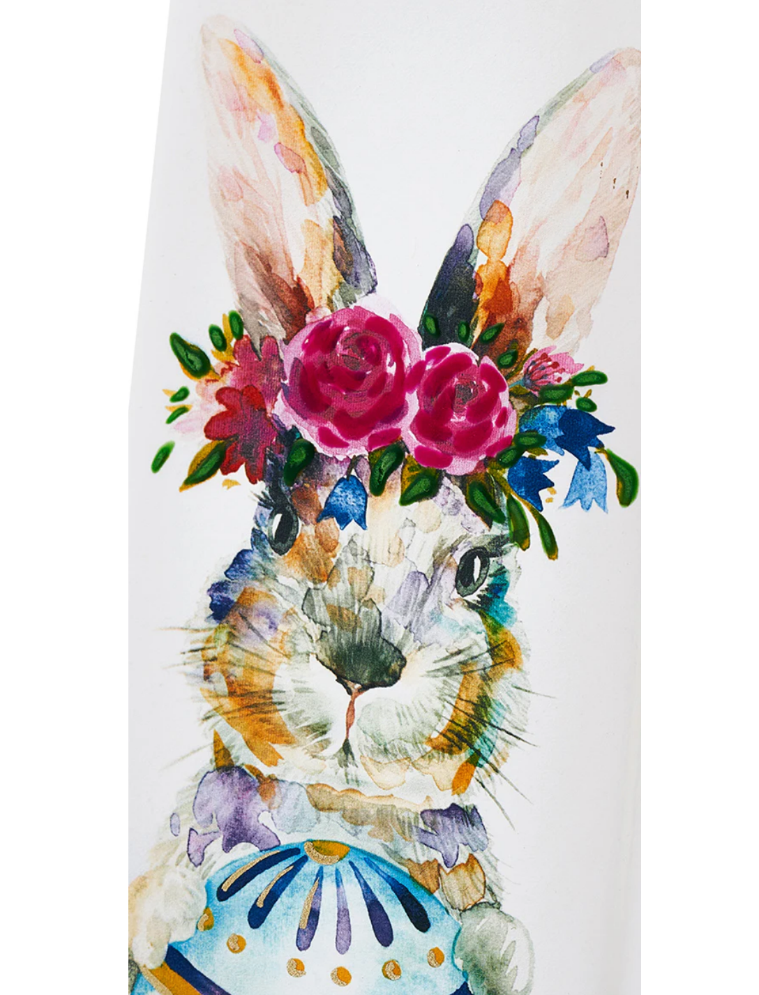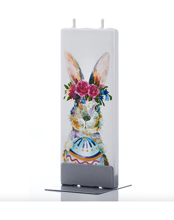 A sweet bunny face is the highlight of this beautiful Easter candle design. She's holding a designed Easter egg and crowned with bright flowers, and her colourful watercolour style adds even more interest. This lovely candle offers a beautiful way to add Easter accents to any decor - and is a great gift to tuck in any Easter basket.