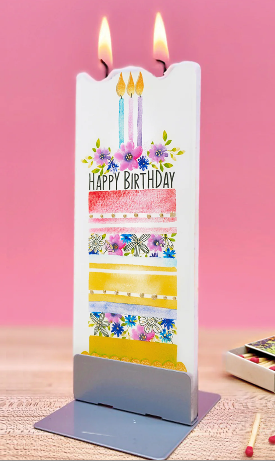 Color blocking and floral prints add plenty of appeal to this pretty layered cake. The Happy Birthday message and trio of candles is the perfect topper for this unique and giftable design.