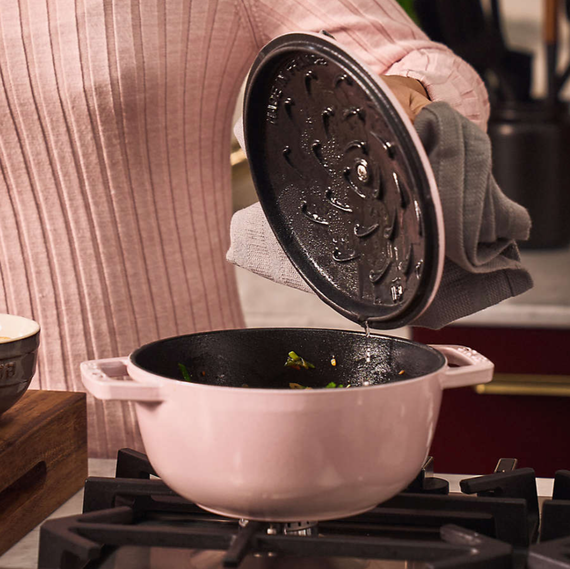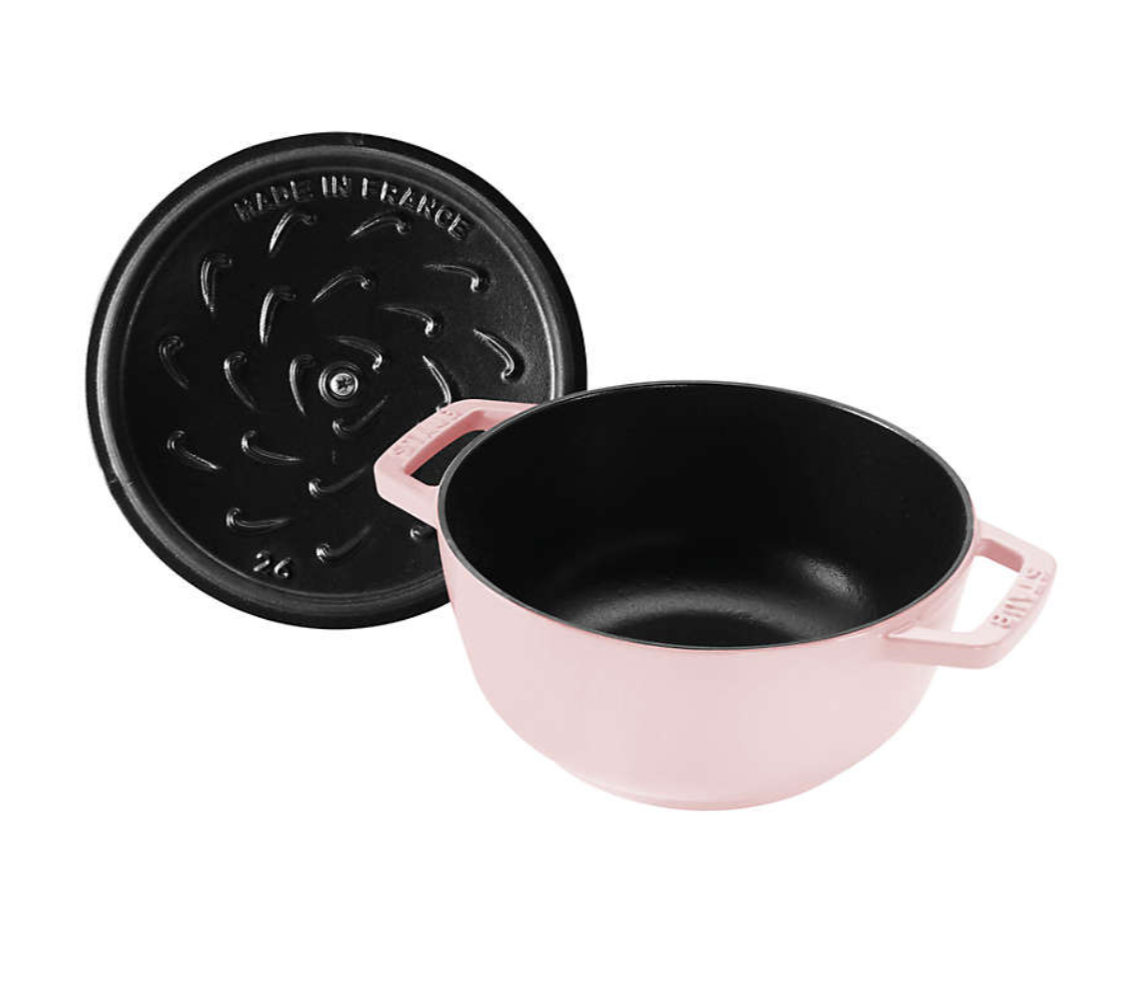 Cook, bake and serve a feast in this heirloom-quality French oven that goes effortlessly from stove to oven to table. Made of heat-retaining cast iron finished with a rosy, peony-inspired glaze, the pot cooks evenly and efficiently and the enamel coating resists chipping. Staub's signature matte black interior excels at braising, roasting and caramelizing and is scratch resistant and easy to clean. The creamy pink French oven is ideally sized for generous batches of rice pudding or mac and cheese. To ensure moist and flavorful results, the uniquely curved spikes inside the domed lid create a rain-forest effect that returns juices back on the food, providing continuous, natural basting. A brass knob adds a gleaming touch of glam.