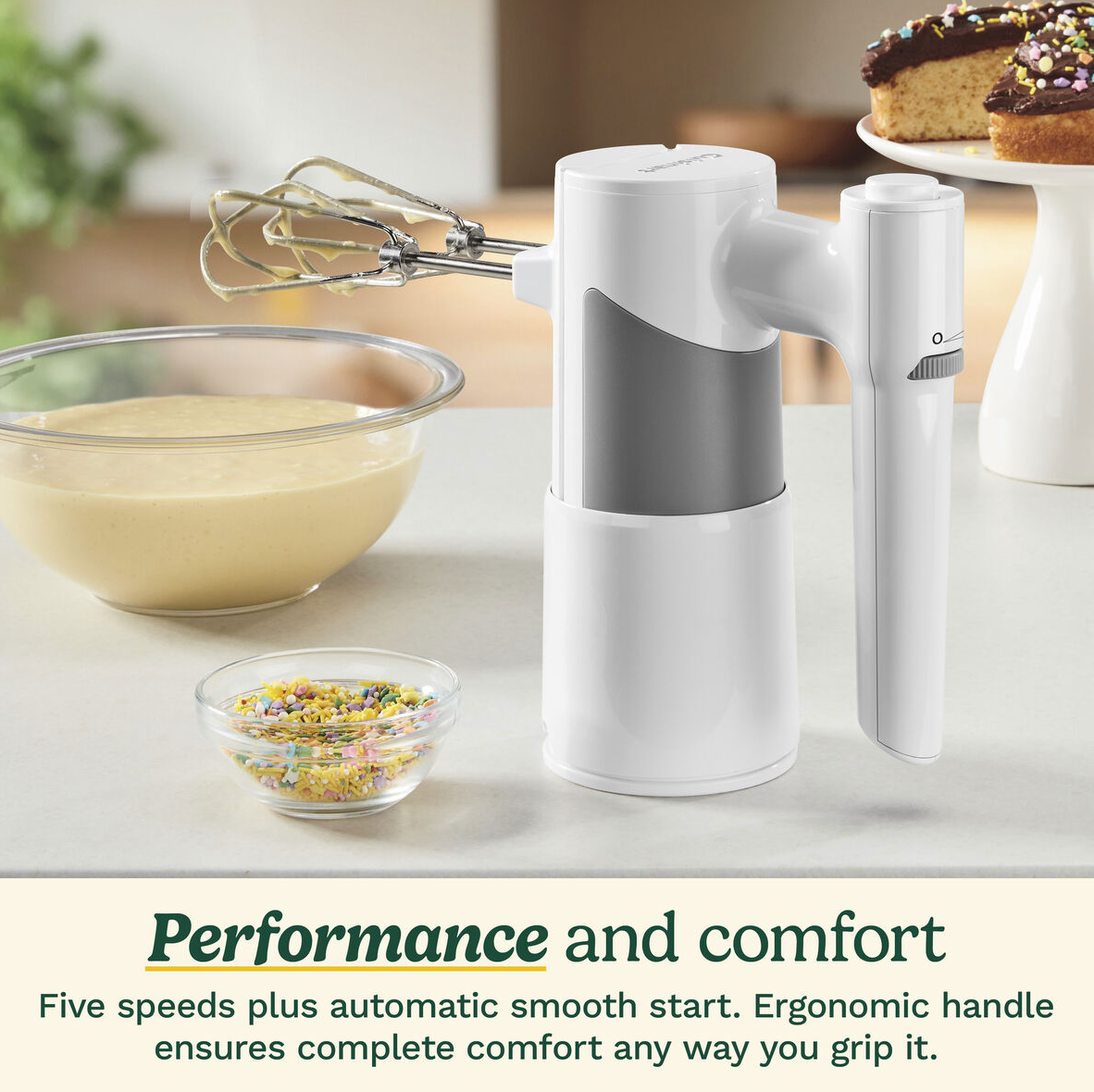 Take control of your mixing with the Cuisinart 5-Speed Hand Mixer. Designed with comfort in mind, it offers six grip positions for personalized use, along with smooth start functionality and a large speed display for optimal control. Compact, powerful, and easy to store, it includes premium beaters, a dedicated chef’s whisk, and built-in cord wrap to keep your kitchen tidy.