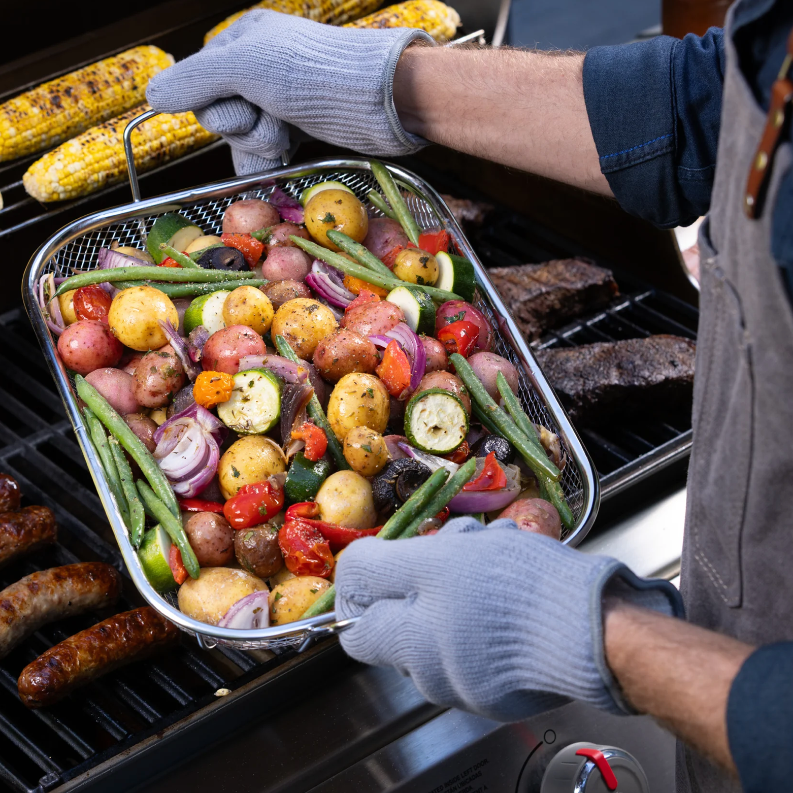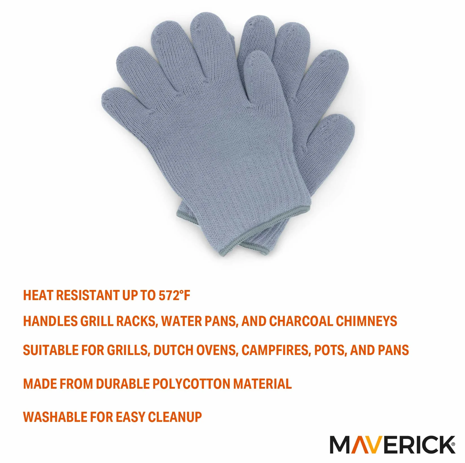 Protect your hands while grilling or cooking with the Maverick Heat Resistant Grill Gloves. Made from durable polycotton, these gloves let you safely handle hot grill racks, water pans, charcoal chimneys, and more. Versatile enough for use with grills, Dutch ovens, campfires, and more, they can withstand heat up to 572°F. Washable for easy cleanup, these gloves provide reliable protection and comfort, making them an essential accessory for any cookout or outdoor cooking adventure.