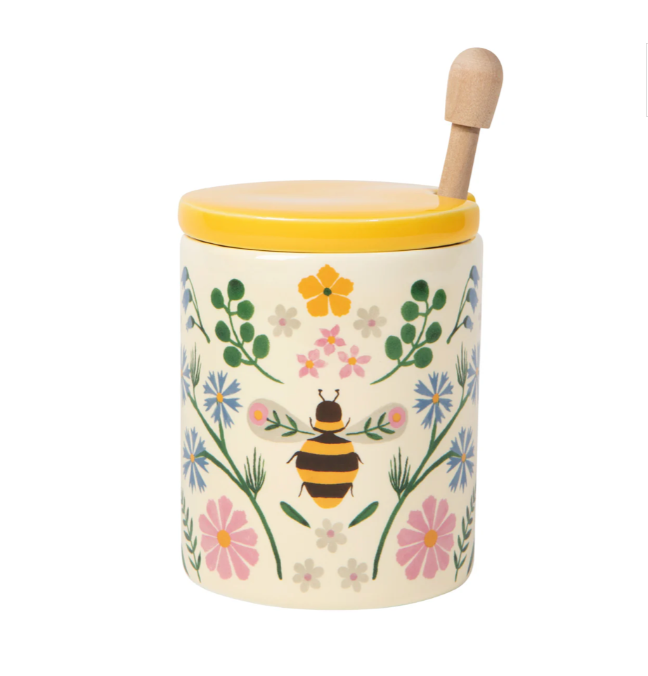 Golden honey makes its home within the gentle curves and notched lid of this Bee Garden stoneware pot. A birch dipper makes drizzling easy. Our Bee Garden collection pays tribute to nature's essential helpers. With a folk art-inspired design featuring bees buzzing among the wildflowers, this cheerful honey pot brings garden-fresh delight to your space.