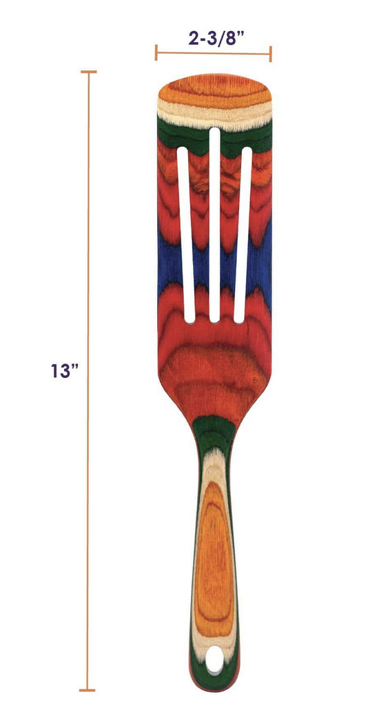 At 13 inches long it provides ample length to get to the deepest of pots for stirring. It's long slim profile is great for serving as well. It features three slots in the serving tool and is safe for use with nonstick. Safe for use on nonstick coatings. Includes a convenient hanging hole for easy storage and display. To clean, hand wash or wipe with a damp cloth; do not soak or wash in the dishwasher. Pair the large turner with the other utensils in the Marrakesh Collection for a bright bouquet of colour in your kitchen!