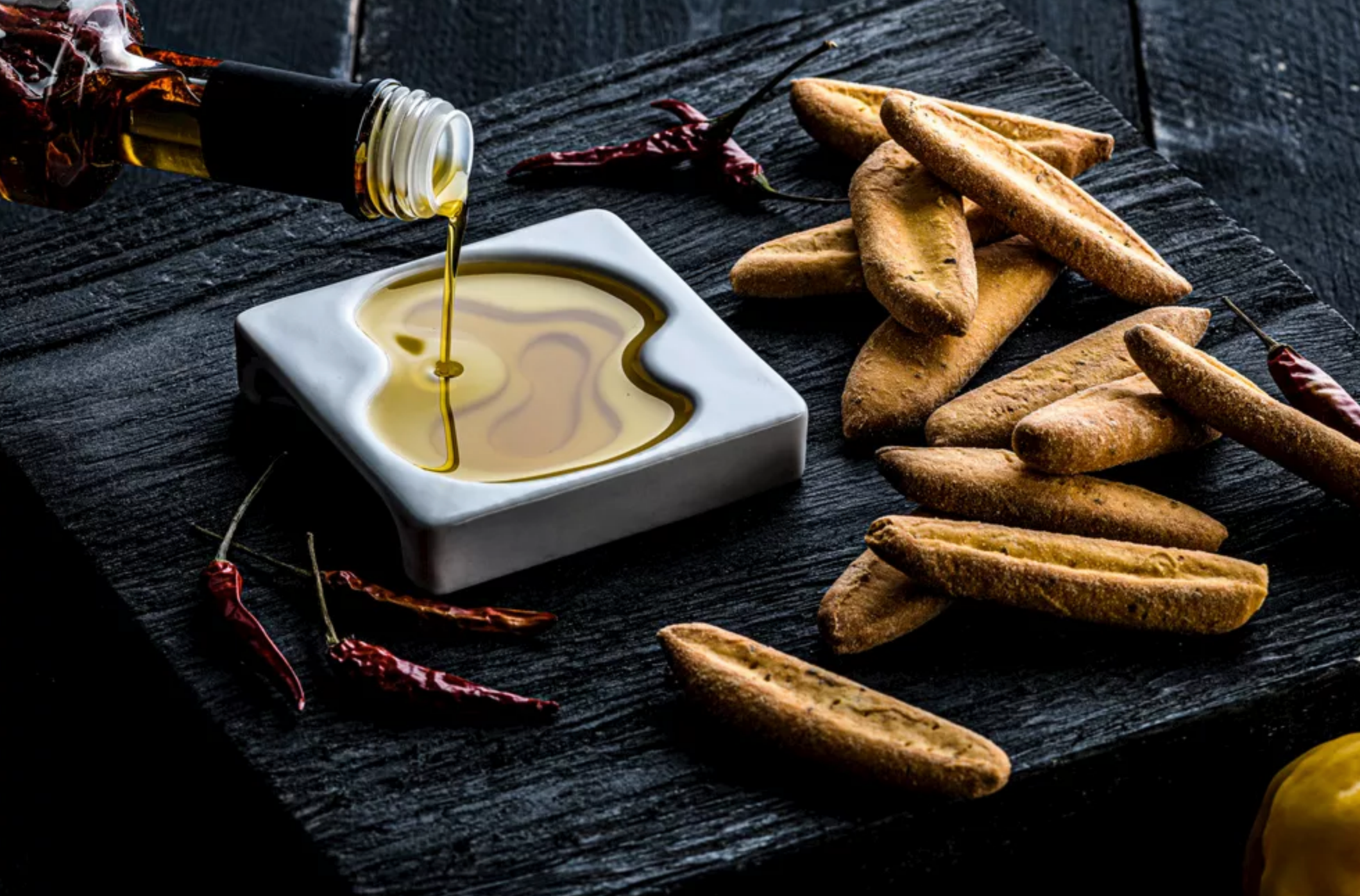 Elegant dishes with abstract pattern for dipping bread. The olive oil colours from light to dark due to the graduated levels. These ceramic bowls measure 9 cm by 9 cm and have a thickness of 1.5 cm.