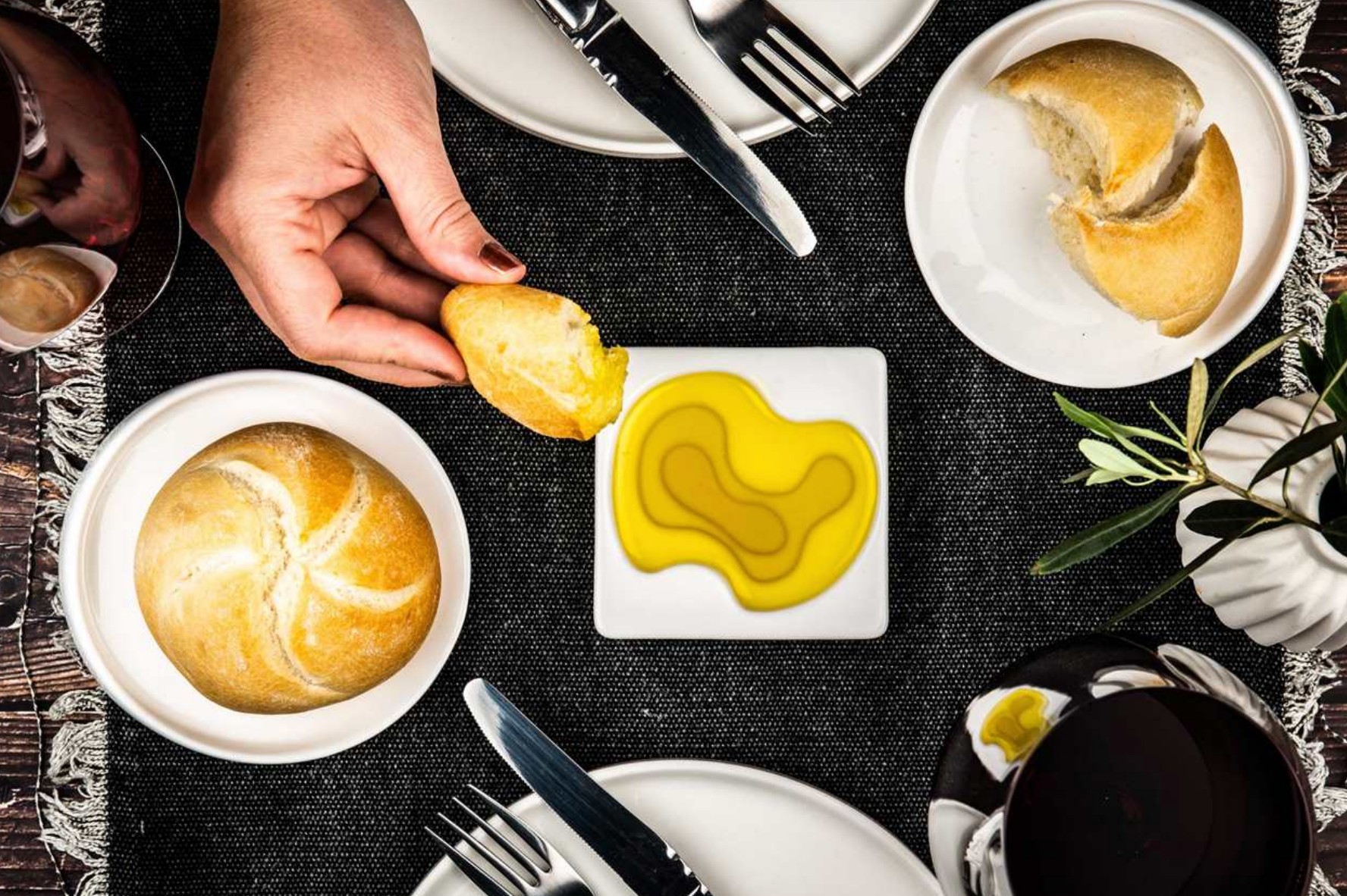 Elegant dishes with abstract pattern for dipping bread. The olive oil colours from light to dark due to the graduated levels. These ceramic bowls measure 9 cm by 9 cm and have a thickness of 1.5 cm. Read more