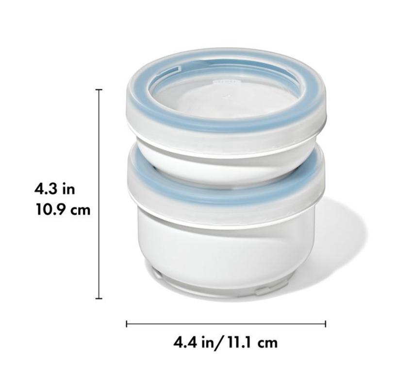 "Lunch or snack mess-free on the move with the OXO Good Grips Small Cup Duo. These leakproof food storage containers come as a set of two – perfect for separating food to keep fresh until mealtime. When you throw your container in your bag, you don’t need to worry about your snack leaking. Why? Because every OXO Prep & Go Container features a watertight lid with a silicone gasket and these cups stack and twist together to lock tight for secure storage and transport. The lid features a clear window to help you spot your snack in a crowded refrigerator without having to open the container. The sleek, ceramic-like look lets your snack container stand out from the crowd.
