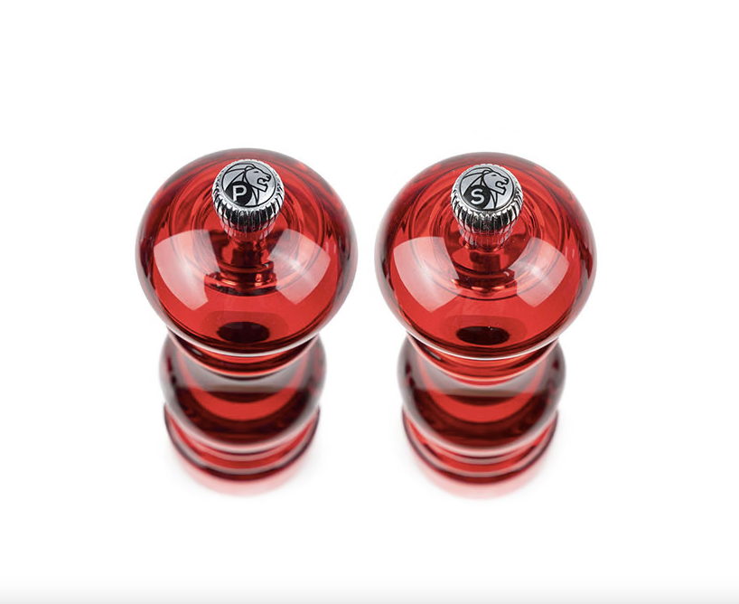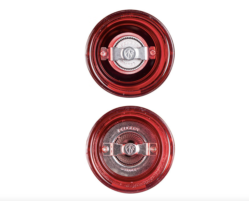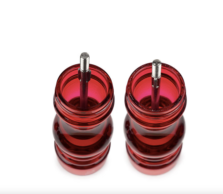 A beautiful clear red set of mills. Adjustment of grind is made by tightening or loosening the screw top.