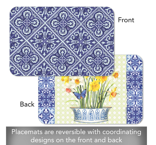 Reversible Easy Care Plastic Placemat with coordinating image on each side. Easy Care Placemat protects your table or countertop from spilled food or stains. Beautiful artistic design on both sides so you have double the designs to choose from! Elegant and effortless.