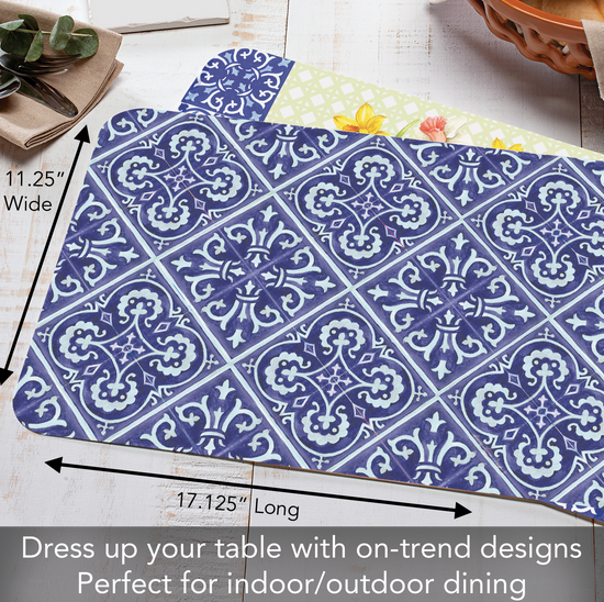 - Placemat is reversible, featuring coordinating different designs printed on front and back. Attractive coordinating designs are great for everyday meals, parties and outdoor entertaining.