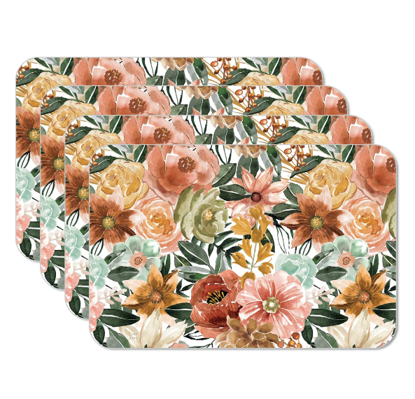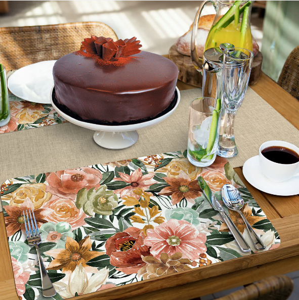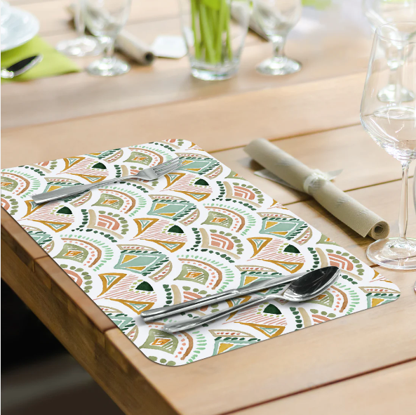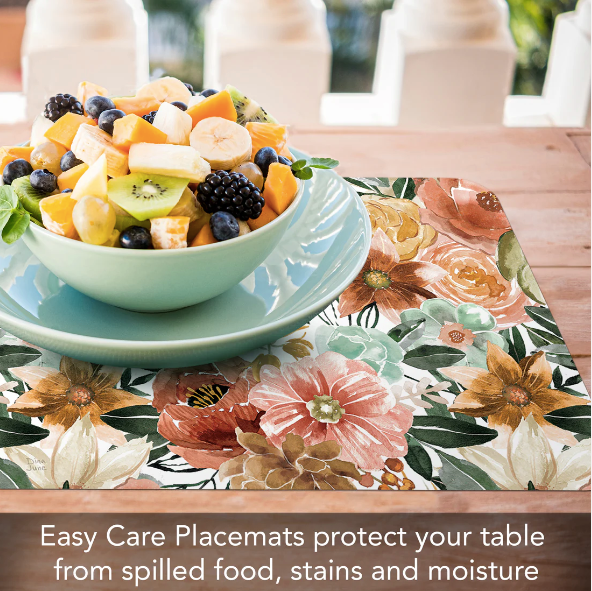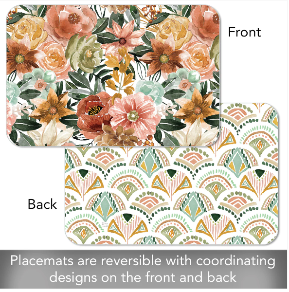 Beautiful reversible placemats that protect your table or countertop from spilled food, scratches, or stains. The material prevents liquids from soaking through to your surfaces. Each Placemat features a coordinating design printed on the opposite side. Read more