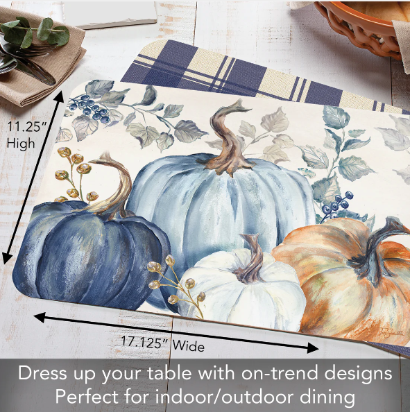 MEASUREMENTS-Each Placemat measures 17.13” x 11.25” x 0.15”. Placemats are an easy and inexpensive way to change the look of your dining space. Check out our Seasonal designs to decorate for the Holidays.