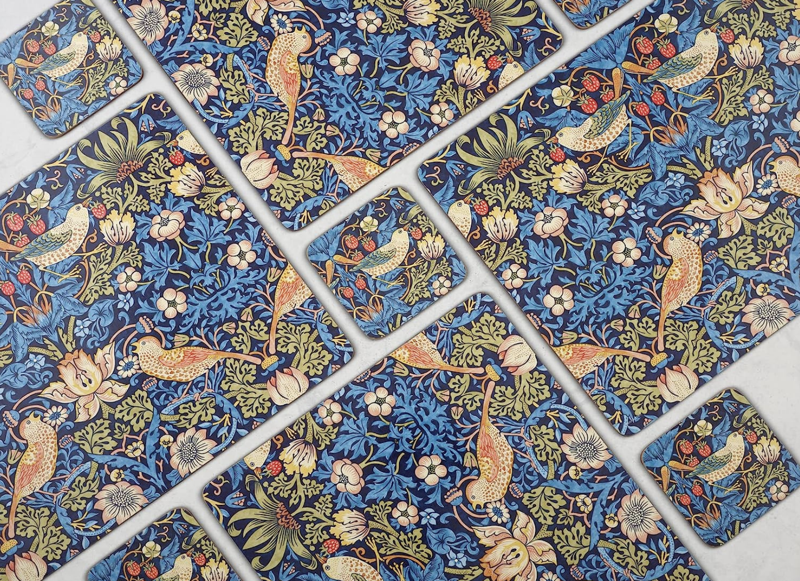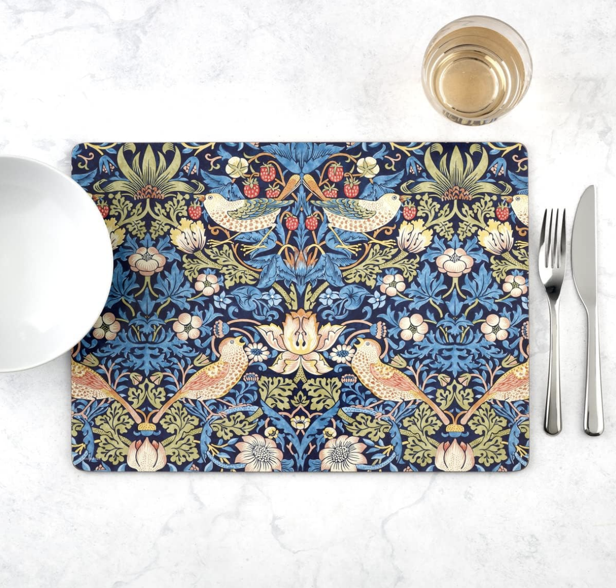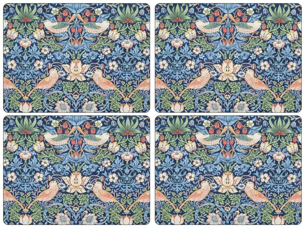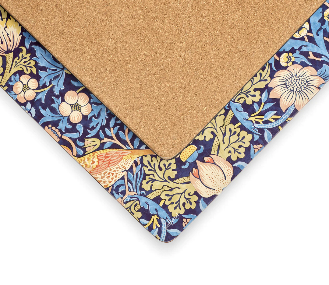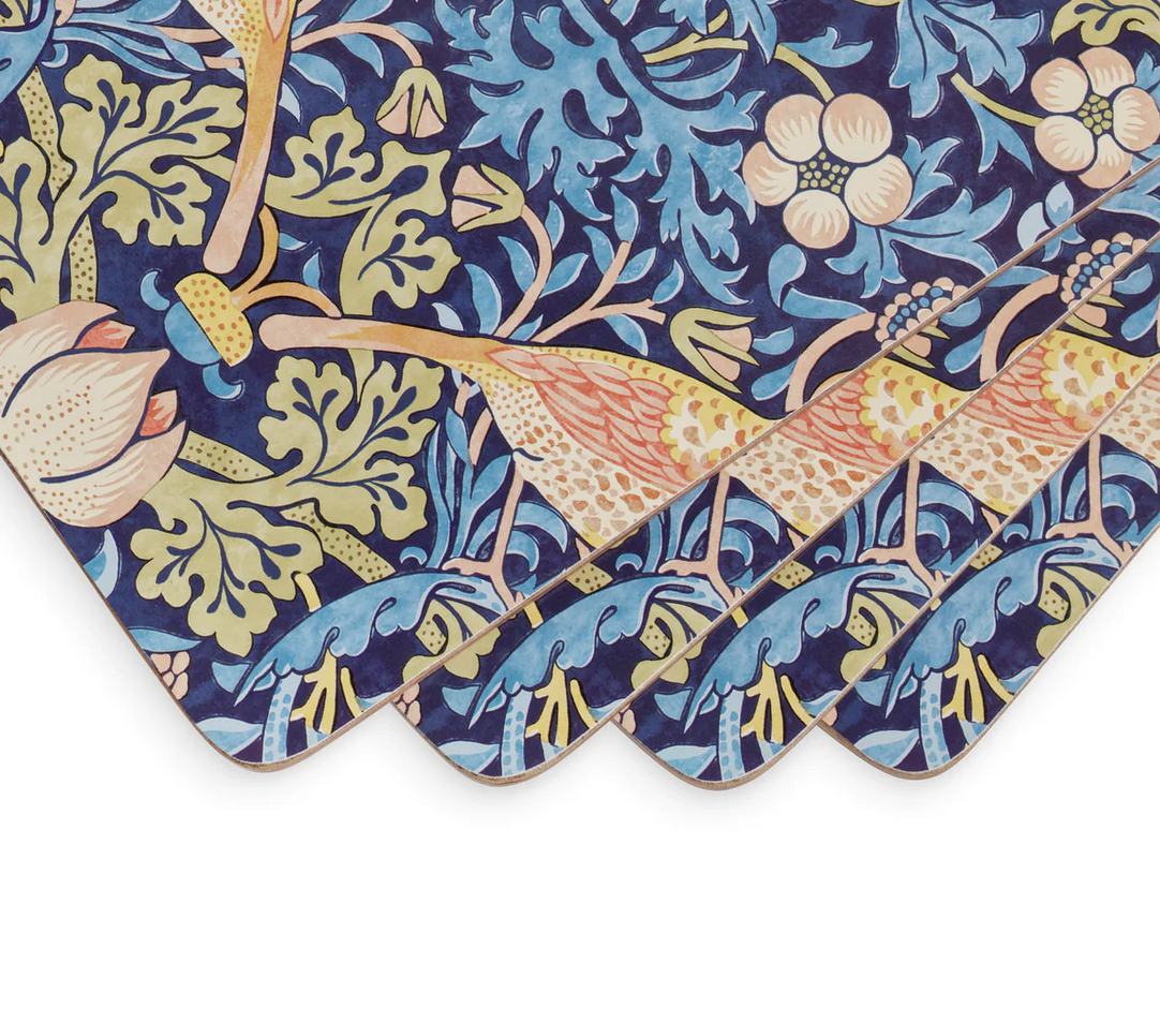 Pimpernel is the premier brand for placemats, coasters, trays and tabletop accessories. Our quality coasters use a 5mm board topped with a unique art print. Each is totally sealed with a high quality coating that is both stain and heat resistant to 100°C. The coaster is then finished with a hardwearing cork back that protects precious furniture. You will also find the perfect placemat to match. The intricate Strawberry Thief design forms part of the Morris & Co for Pimpernel collection. William Morris was one of the most influential designers of the nineteenth Century and through his company, Morris & Co., he produced some of the most fashionable and exciting textiles and wallpapers of his era.Â