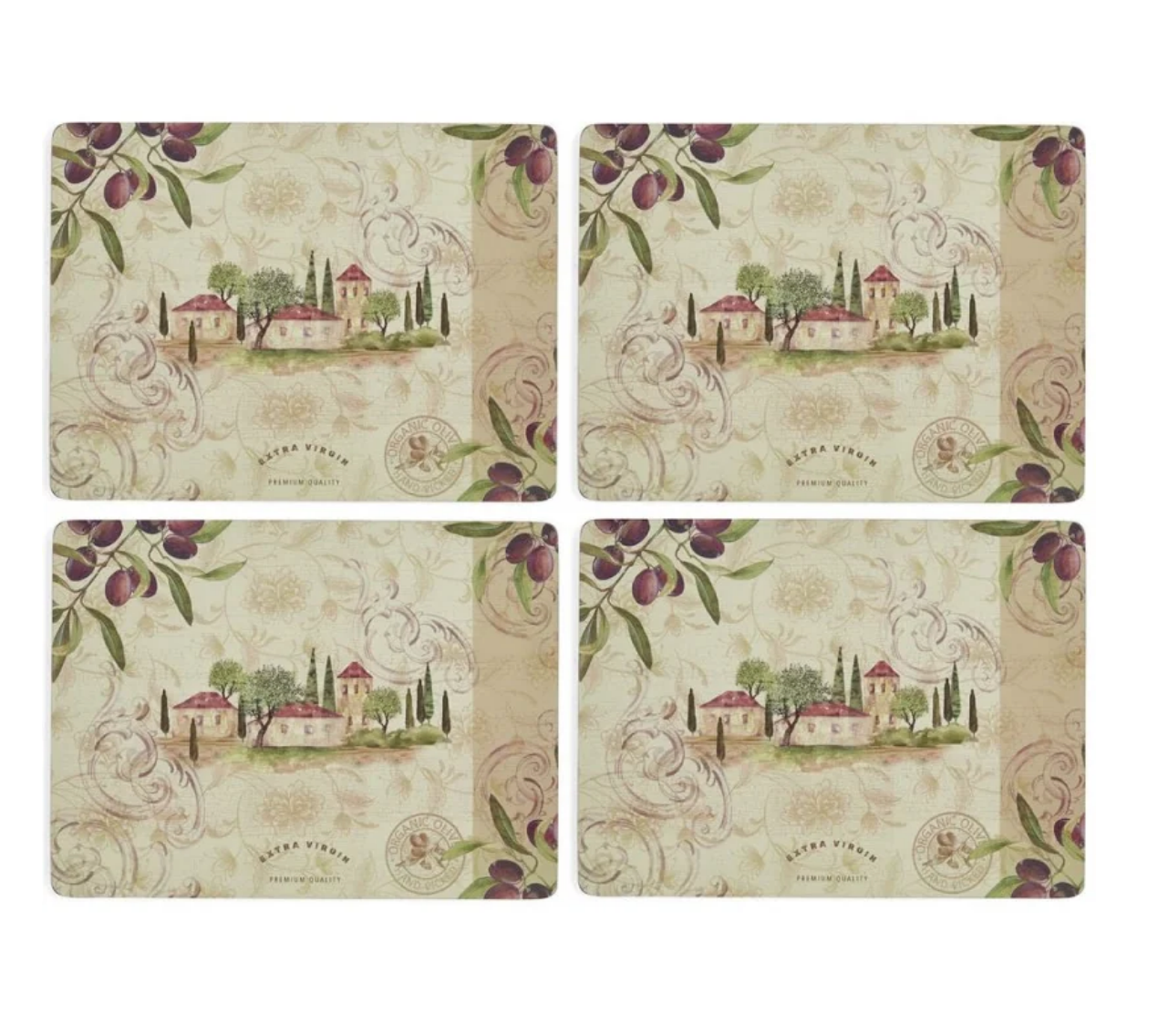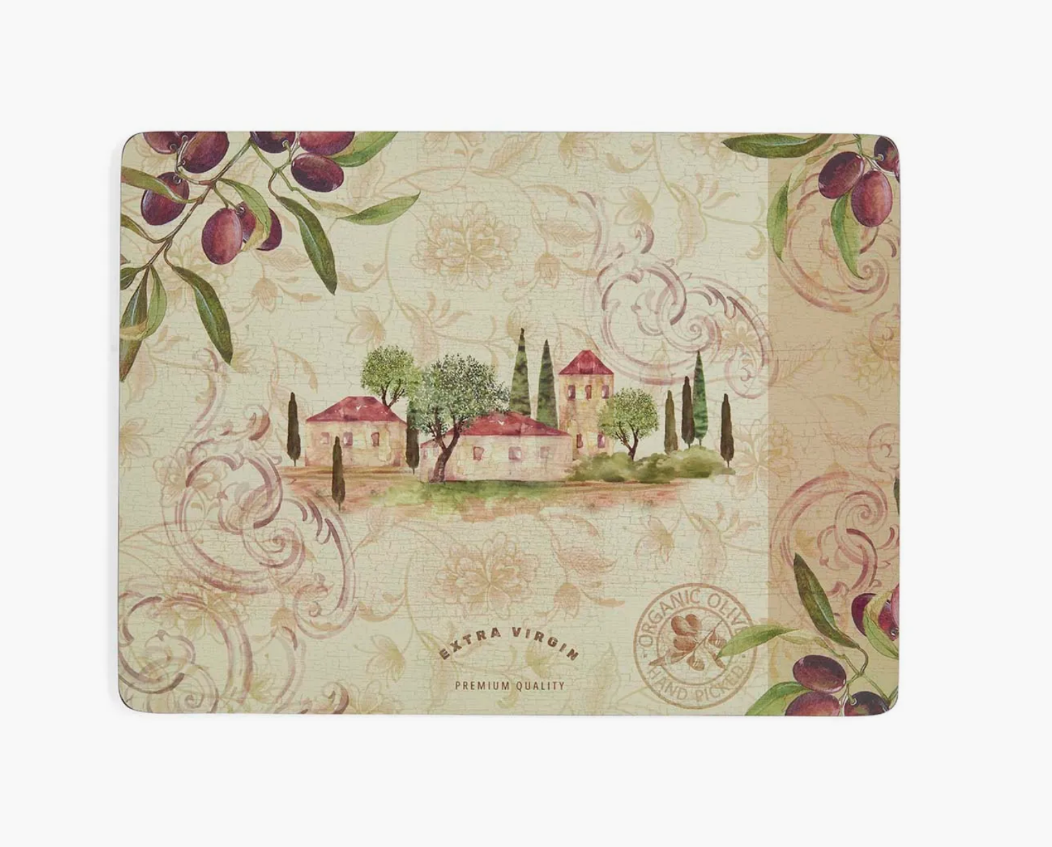 Sit back and savour the sweet taste of the Mediterranean with this set of four charming Olive Orchard placemats. Exquisitely decorated with ripe olive branches and an idyllic village scene, they’re ideal for any occasion, be it a simple family supper or a dinner party with friends. Carefully crafted using sturdy 5mm board and sealed using high-quality lacquer, each placemat in this lovely set is heat resistant, stain resistant and a dream to clean. The set is also cork backed to protect your furniture. Go for full-on rustic vibes by adding a set of six matching coasters.