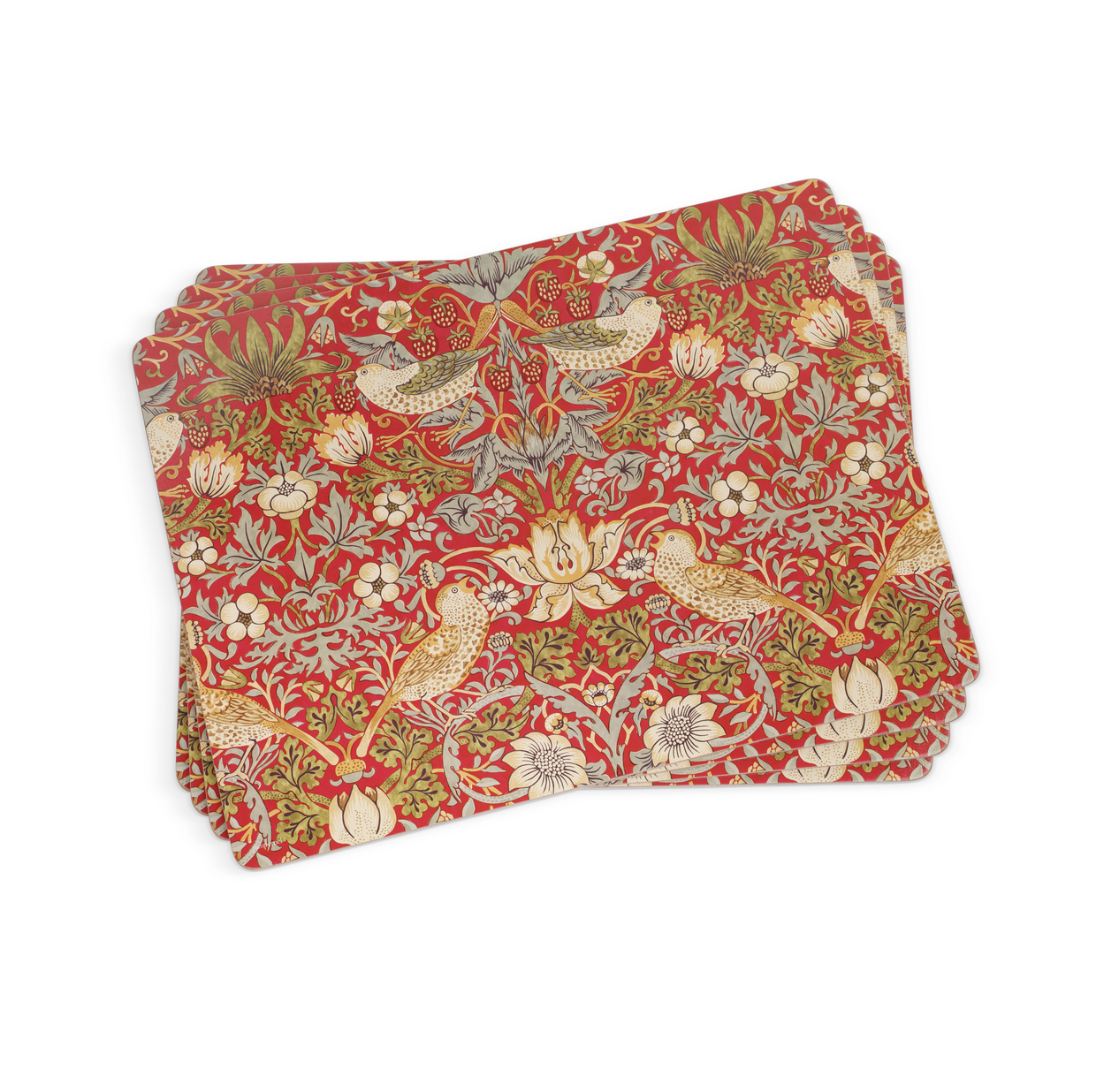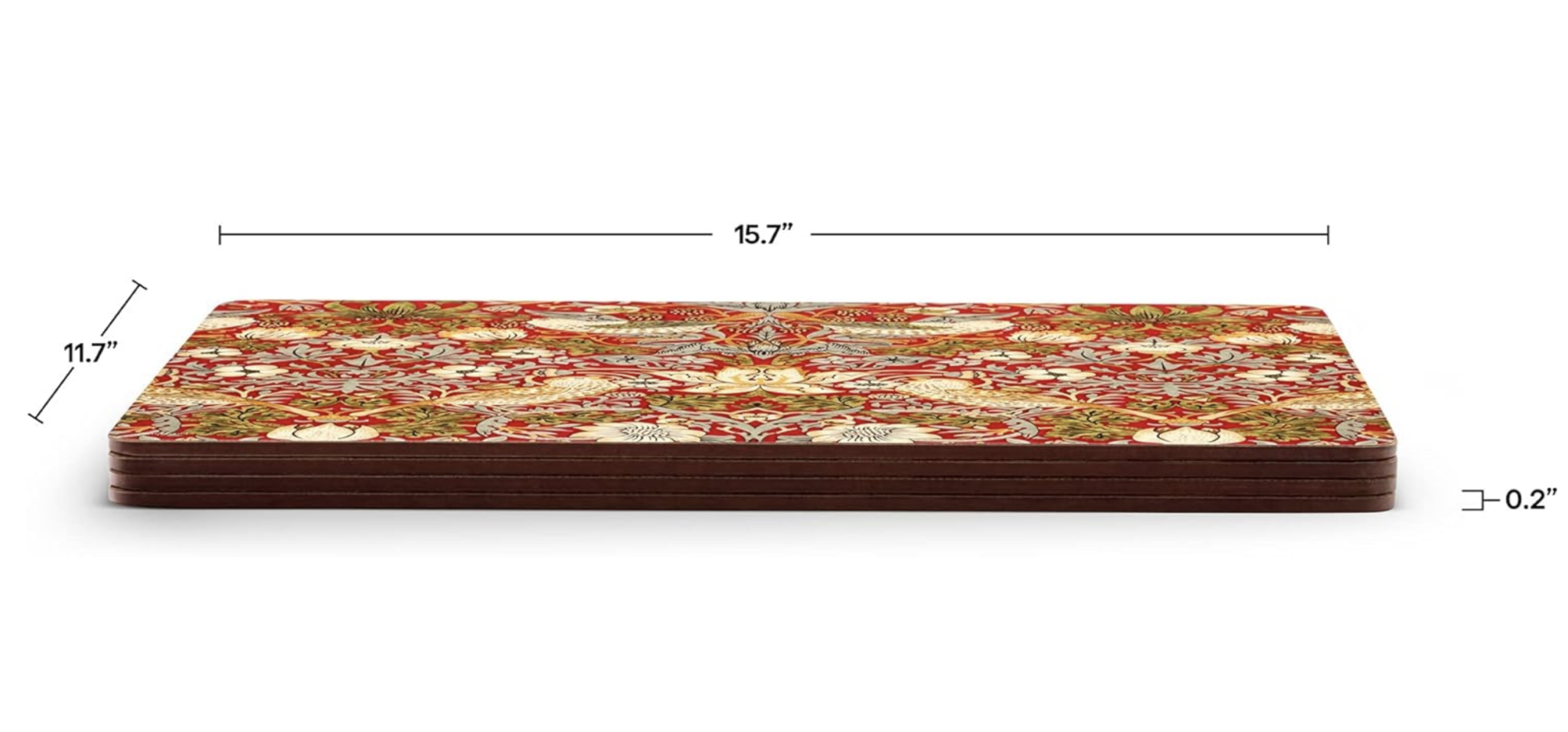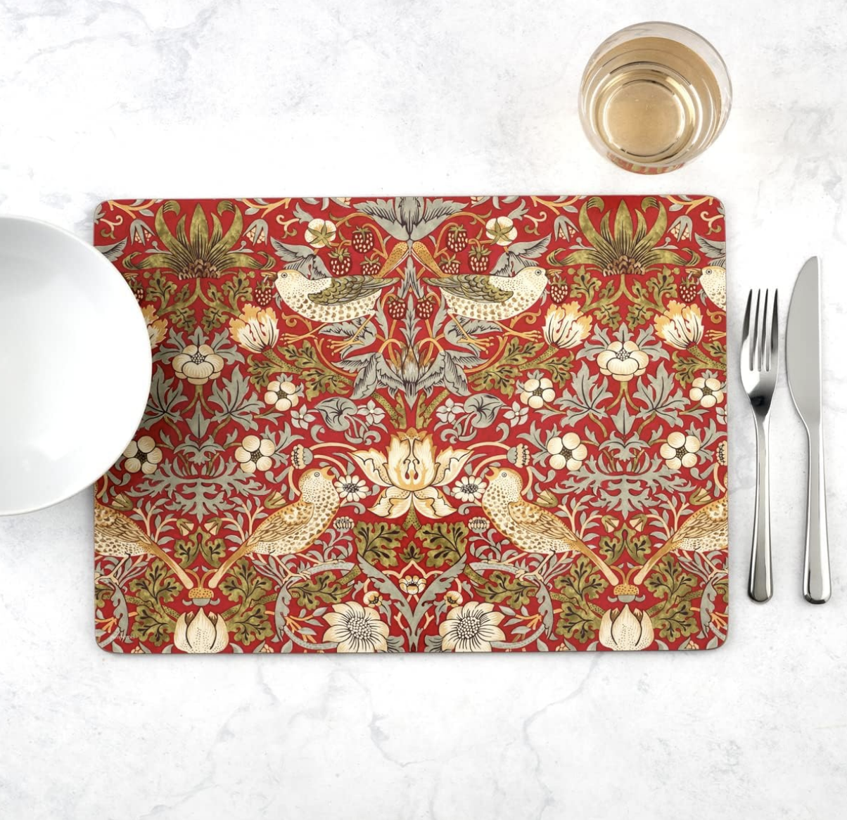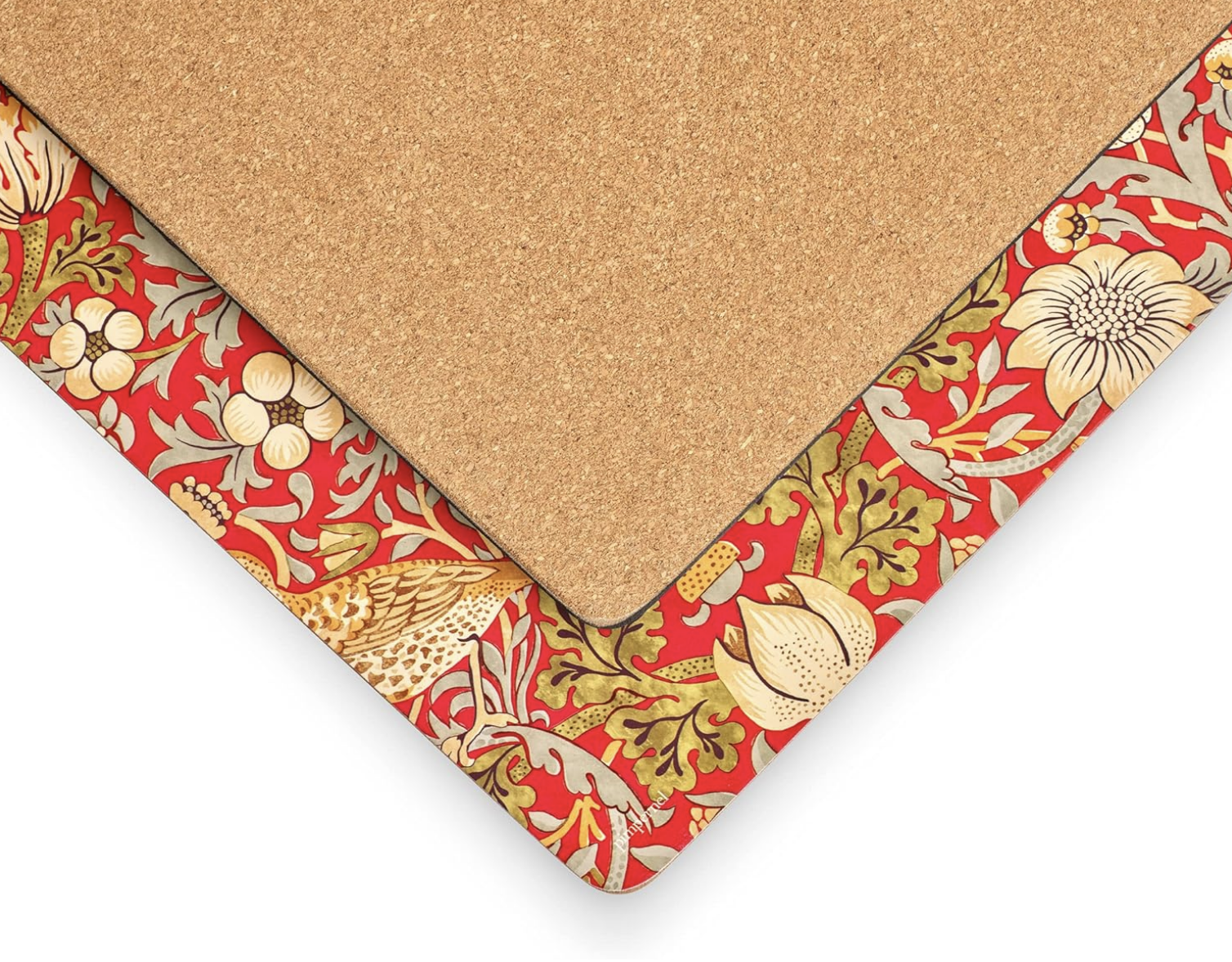 Pimpernel quality placemats and coasters use a 5mm board topped with a unique and exclusive art print. Each is totally sealed with a high quality coating that is both stain and heat resistant to 212F. The placemats and coasters are then finished with a hard-wearing cork back that protects precious furniture. The intricate Strawberry Thief design forms part of the Morris & Co for Pimpernel collection. William Morris was one of the most influential designers of the nineteenth Century and through his company, Morris & Co., he produced some of the most fashionable and exciting textiles and wallpapers of his era.