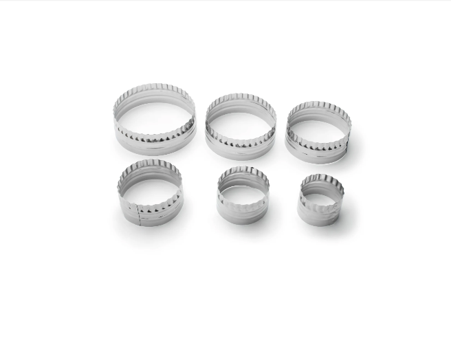 Create fun-to-decorate cookies with this double-sided cookie cutter set! This set includes six round cutters, each featuring a plain and crinkled edge. Due to its two-in-one design, you can free up storage space easily. These shapes will slice through and release from dough easily, bringing ease to the cookie prep process. Constructed of sturdy stainless steel, the cutters have an attractive shine and luster that will be best preserved when hand washed and dried completely after use.