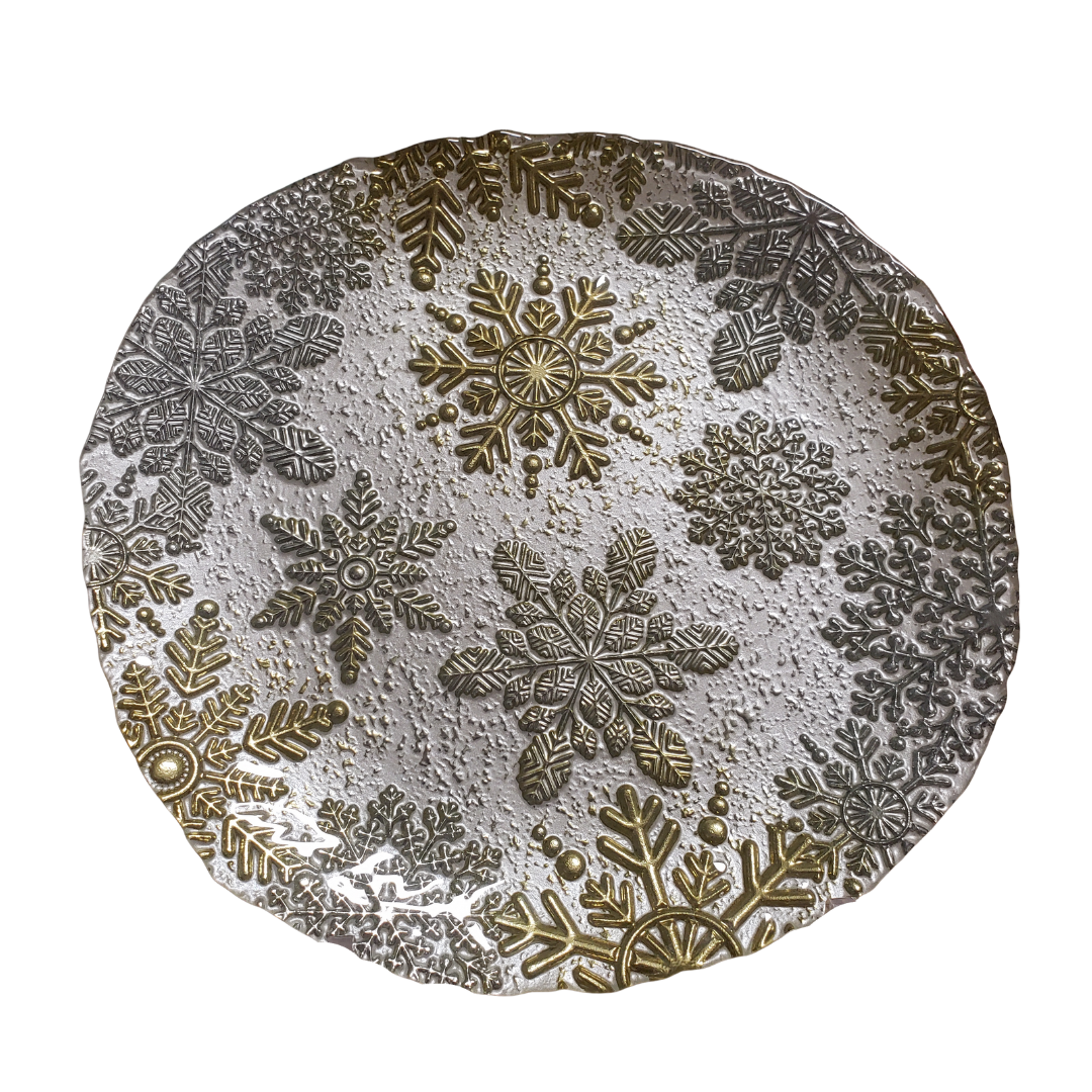 This gorgeous winter wonderland plate, with gold and silver snowflakes through out the top, creates a festive and convivial atmosphere, perfect for holiday meals or special occasions.