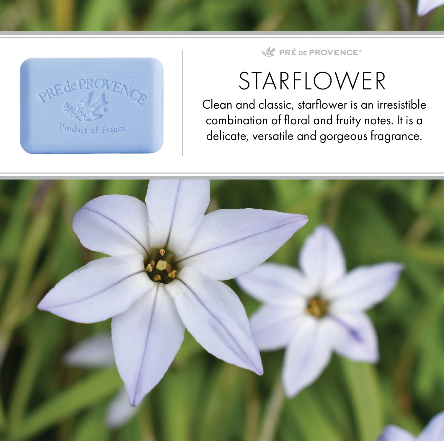 Pre de Provence Soap Shea Enriched Everyday French Soap Bar - Star Flower. Clean and classic, starflower is an irresistible combination of floral and fruity notes. it is a delicate, versatile and gorgeous fragrance. Read more