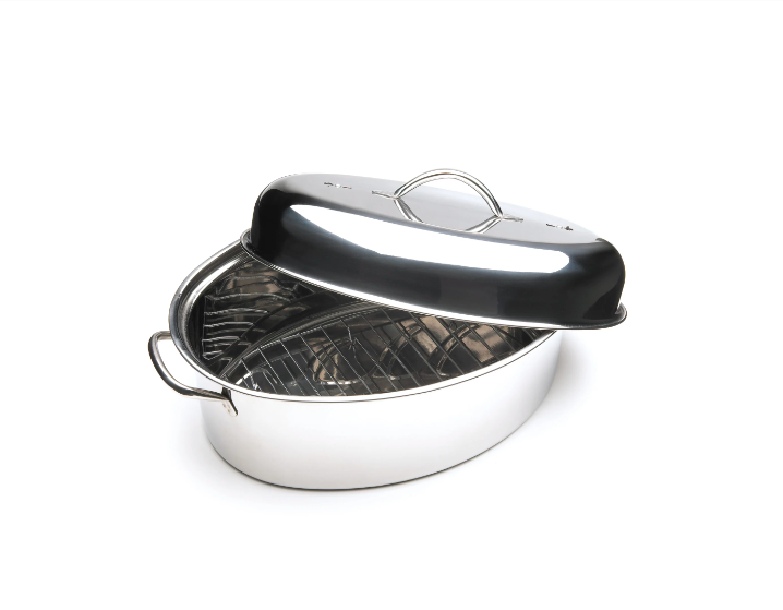 Roast your favorite poultry, meat, seafood, or vegetables using this large 10-quart/10L Oval Roaster! Made of durable 18/0 stainless steel, heat is evenly circulated to give your dish the perfect roast. This set includes a removable chromed roasting rack that elevates your meat, underneath which will fill with succulent juices, and a high domed lid that keeps your roast at the ideal temperature. This oval roaster set is perfect for your chicken and beef dishes, as it allows proper roasting by lifting your Thanksgiving or holiday turkey, chicken, rib roast, or duck up out of its juices for an even, all-around browning. You can also easily baste your roast in its own juices to keep it moist, tender and tasty. Be the hit of the holidays with this set!