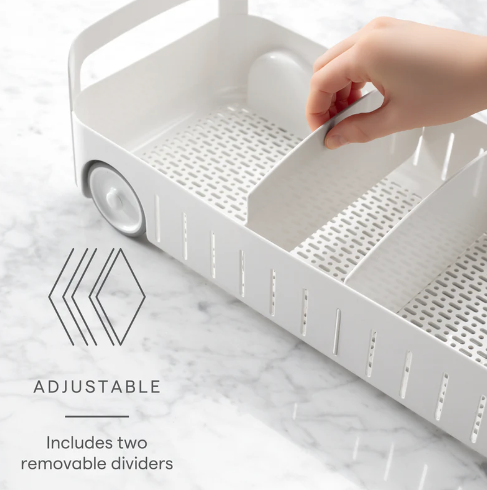 RollOut® Under Sink Caddy tackles the messiness of your deepest, darkest cabinet. It keeps items off the floor and ready to roll into the light with sturdy handles and back wheels. Adjustable dividers create separate storage spaces and a bonus basket hangs where you want. When under sink supplies are organized, you can clean (and rest) easy.