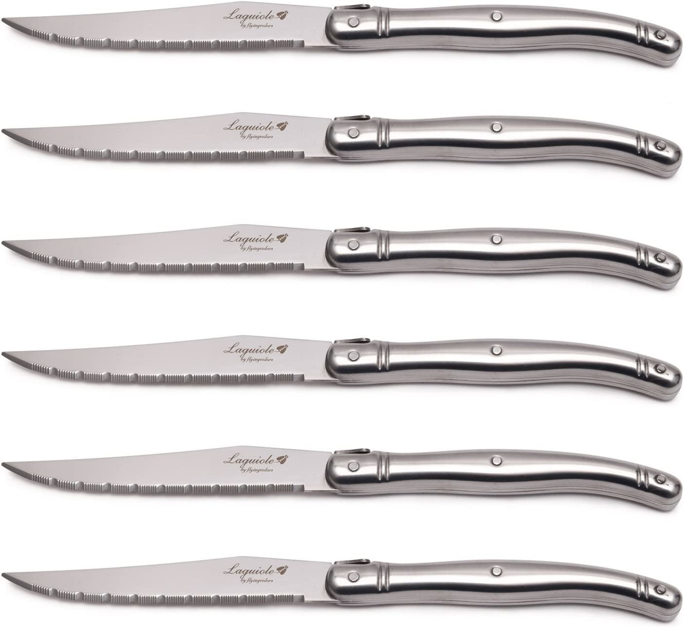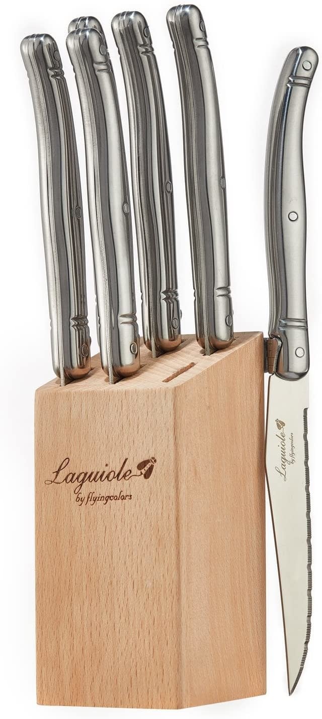 This set of Laguiole Jean Debost steak knives comes complete with a wooden block, making it an impressive collection for entertaining. The Jean Dubost company, founded in 1920, chooses the best steels and materials in order to provide Laguiole products 100% made in France. Each knife is hand polished and finished for a difference in quality you can really see and feel, with the utmost respect for the cutlery tradition.