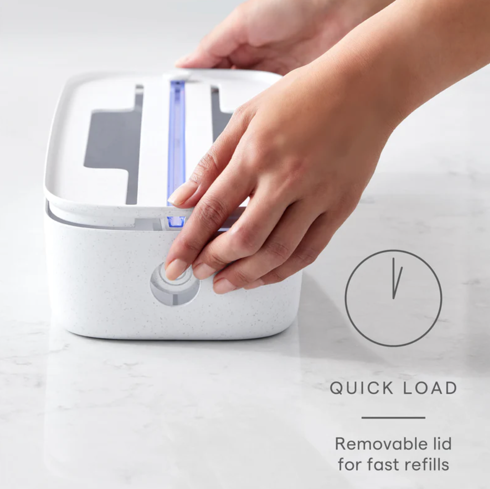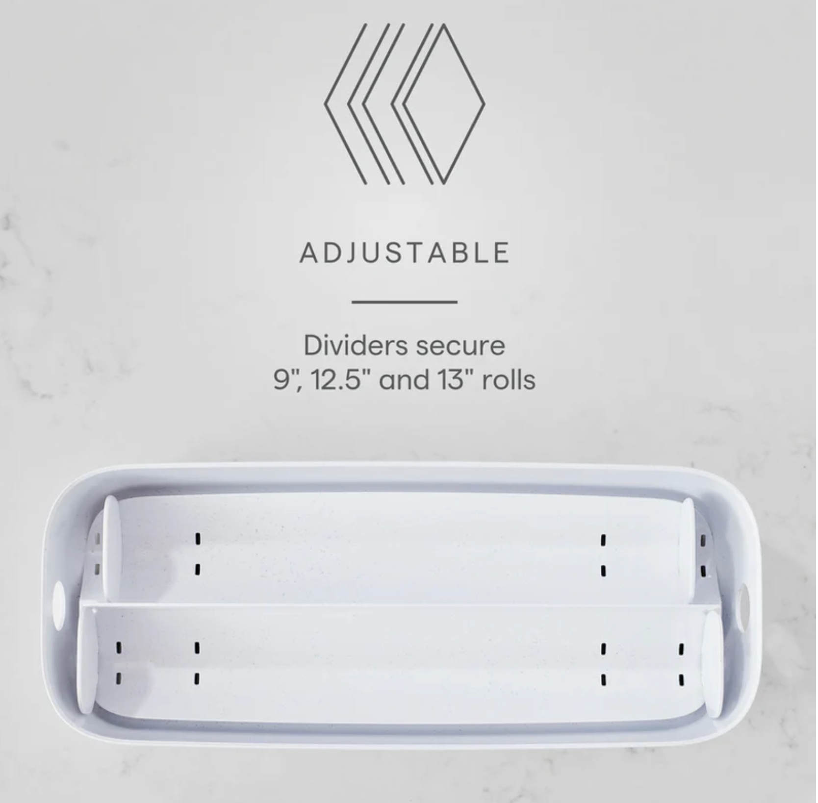 StoraRoll™ Wrap Dispenser puts an organized spin on your kitchen routine. Aluminum foil, plastic wrap, parchment and wax paper pull through wide slots to stretch across the cutting track. A replaceable safety cutter glides back and forth for a clean cut every time. The removable lid makes reloading quick while the cradle base and adjustable dividers keep rolls centered for smooth dispensing. When grabbing the wrap is an easy task, you’ll do a happy dance.