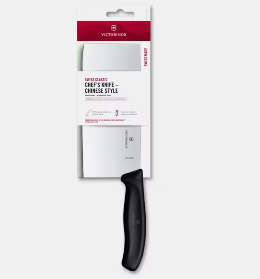 This Chinese Style Chef's Knife is designed for precision and versatility. It features an extra-wide, sharp blade that is crafted from stainless steel. Its lightweight, ergonomic handle ensures comfort and control during extended use. Swiss made and dishwasher safe, it's built for lasting reliability.