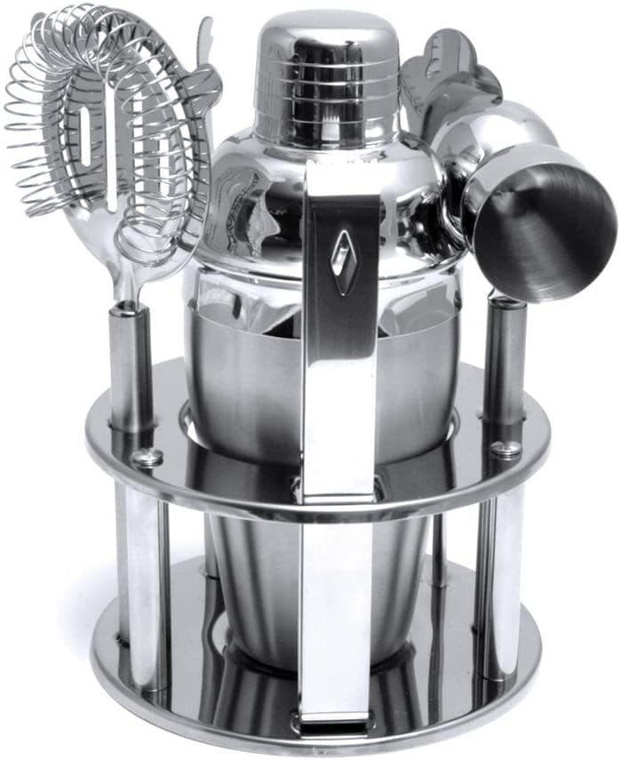 Set comes with a shaker, strainer, bar knife, double jigger, stirrer stick, bottle opener and tool stand.
