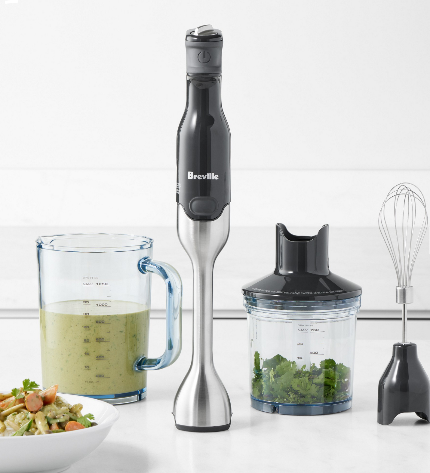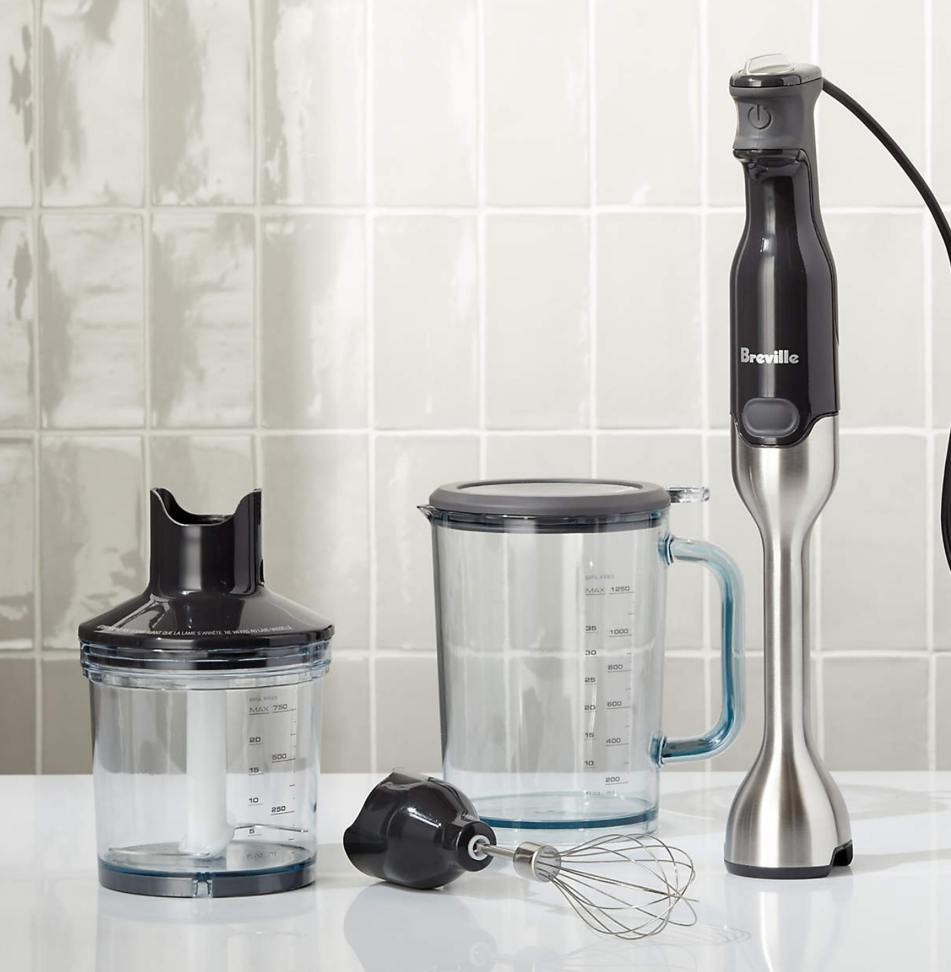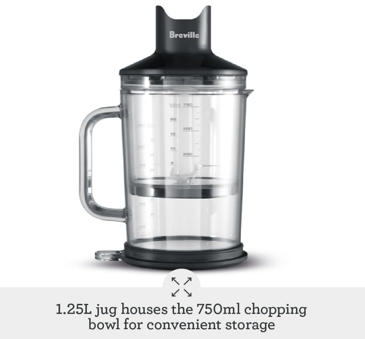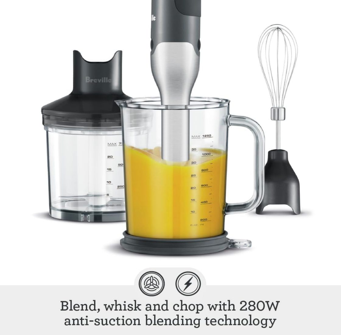 The 8” immersion depth lets you blend large quantities directly into a tall pot or container. And its non-scratch base protects your pots and pans. 42oz jug with dual-purpose storage lid and anti-slip mat. 25 oz. chopping bowl with mini blade system and whisk attachment. The jug houses the chopping bowl for convenient storage.