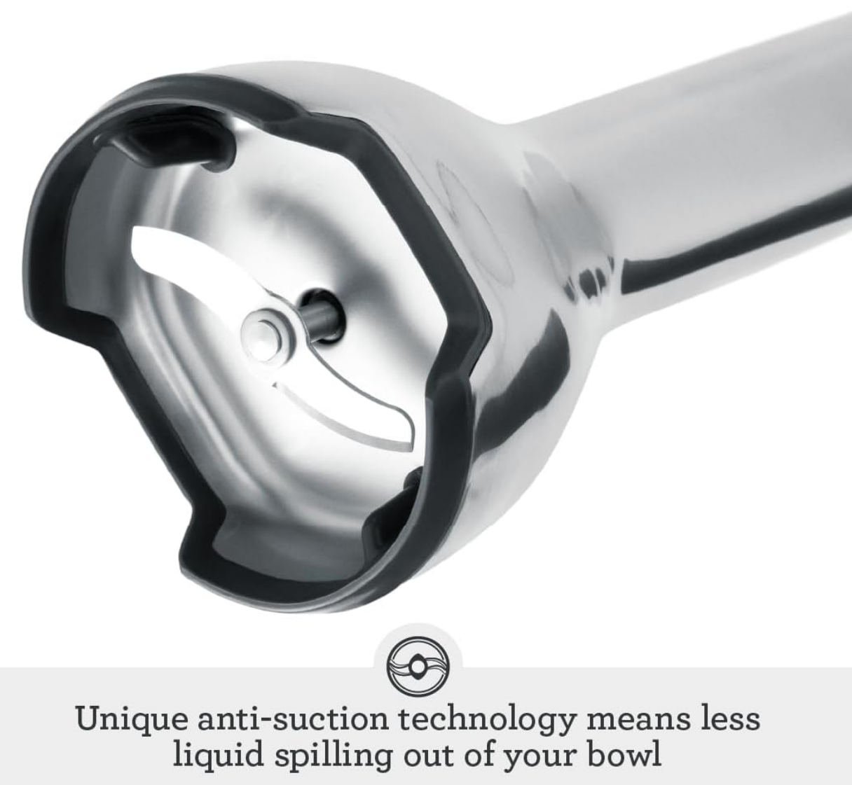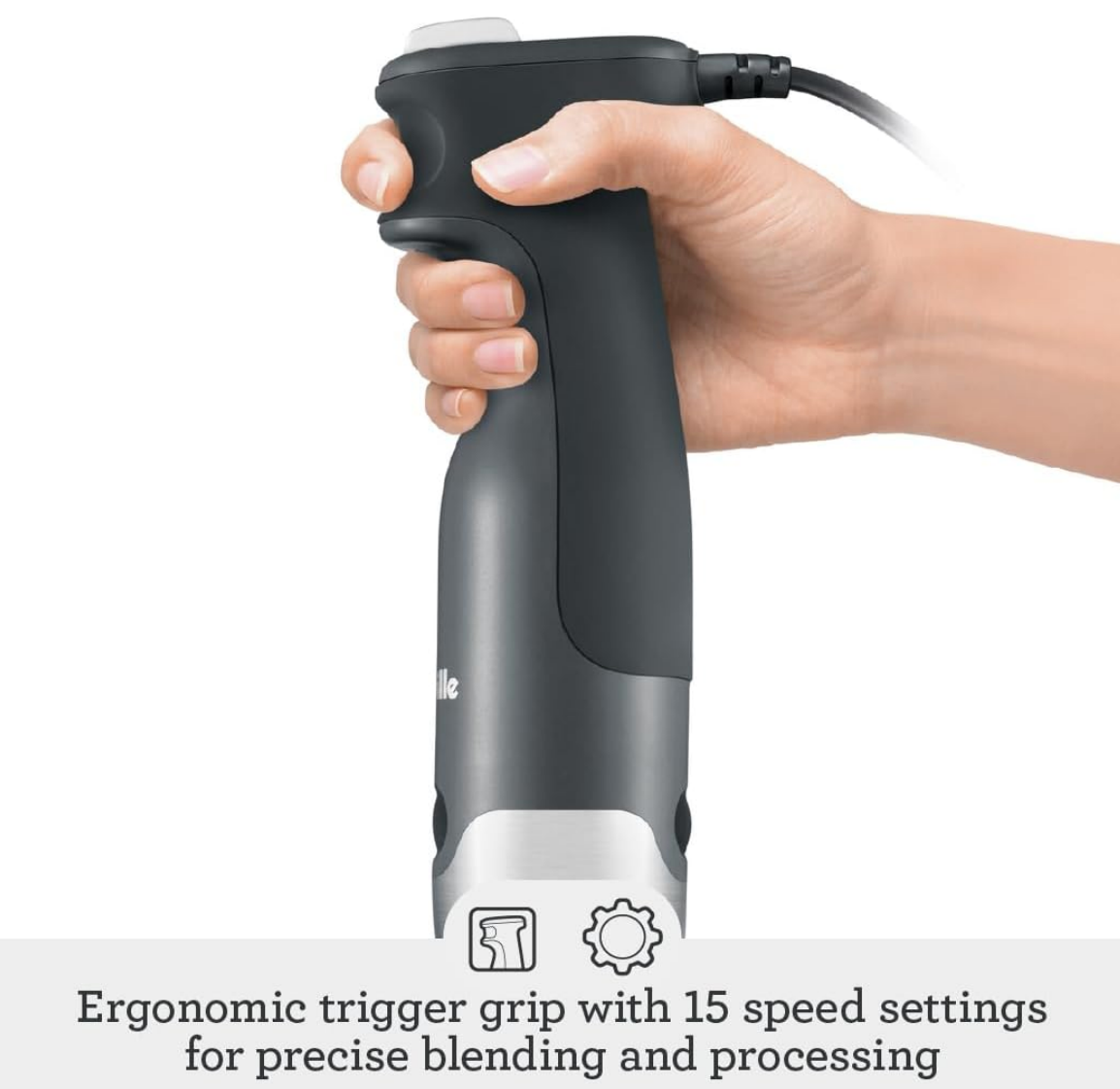 Revolutionary bell-shaped blending base combined with internal ribbing reduces suction for greater control and more efficient blending. Trigger switch operation allows the hand to assume a more natural position and provides increased stability and control with soft touch finish.