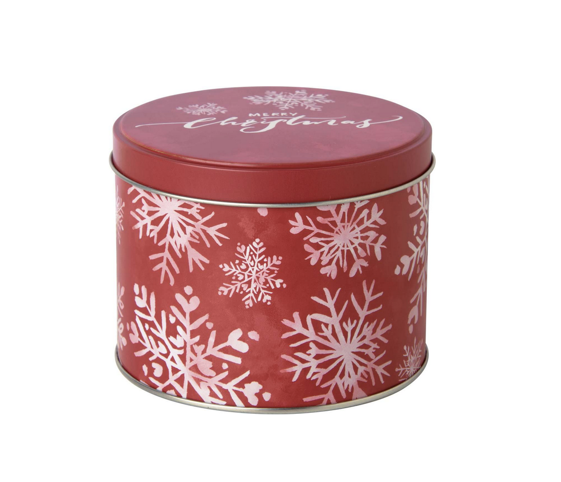 Round Cookie Tin with snowflakes and Merry Christmas written on the lid.