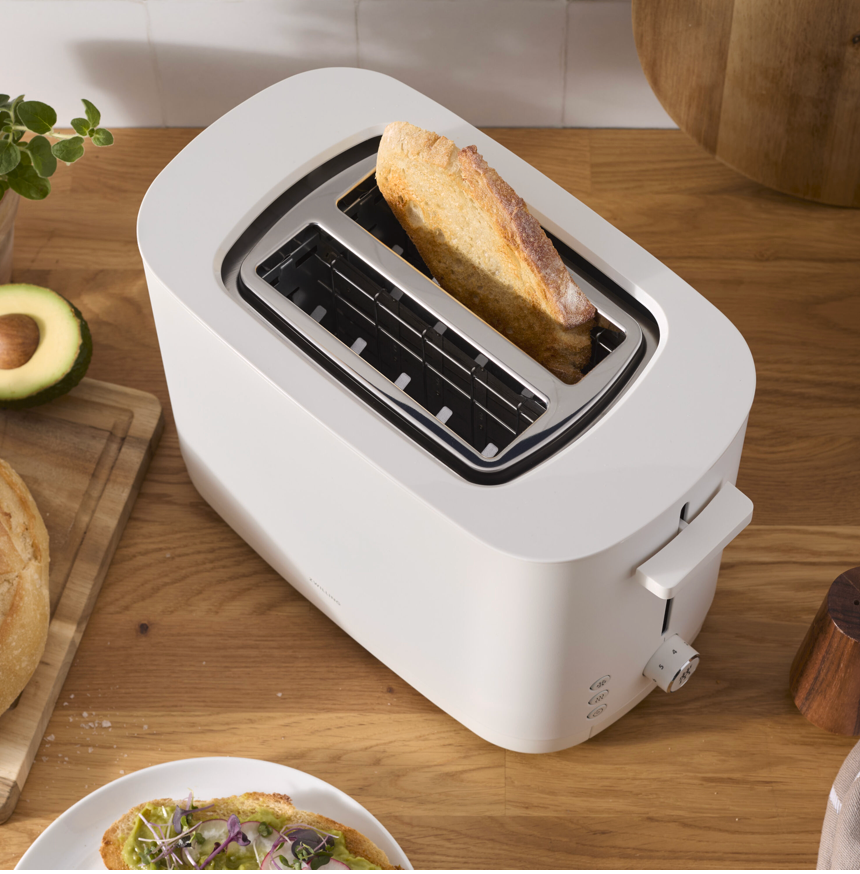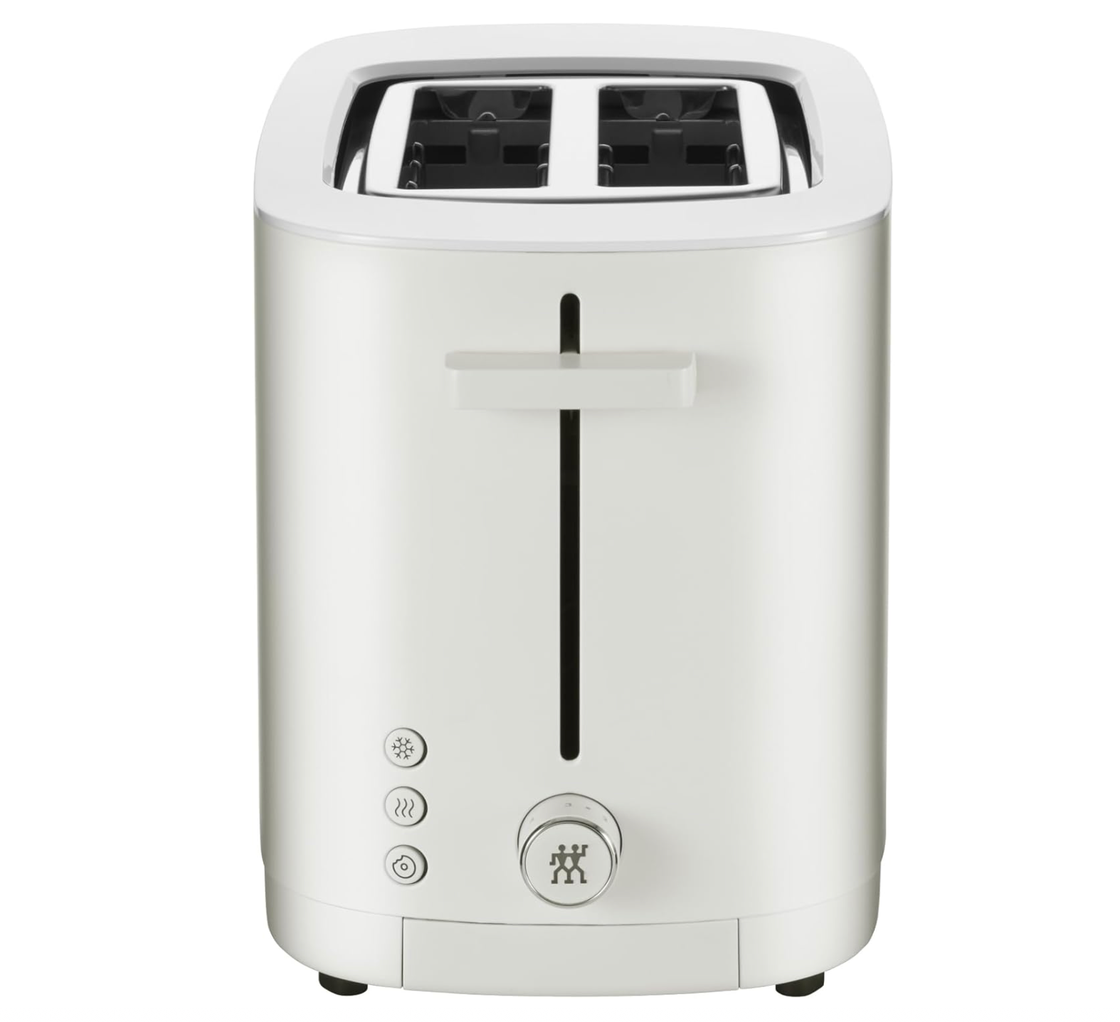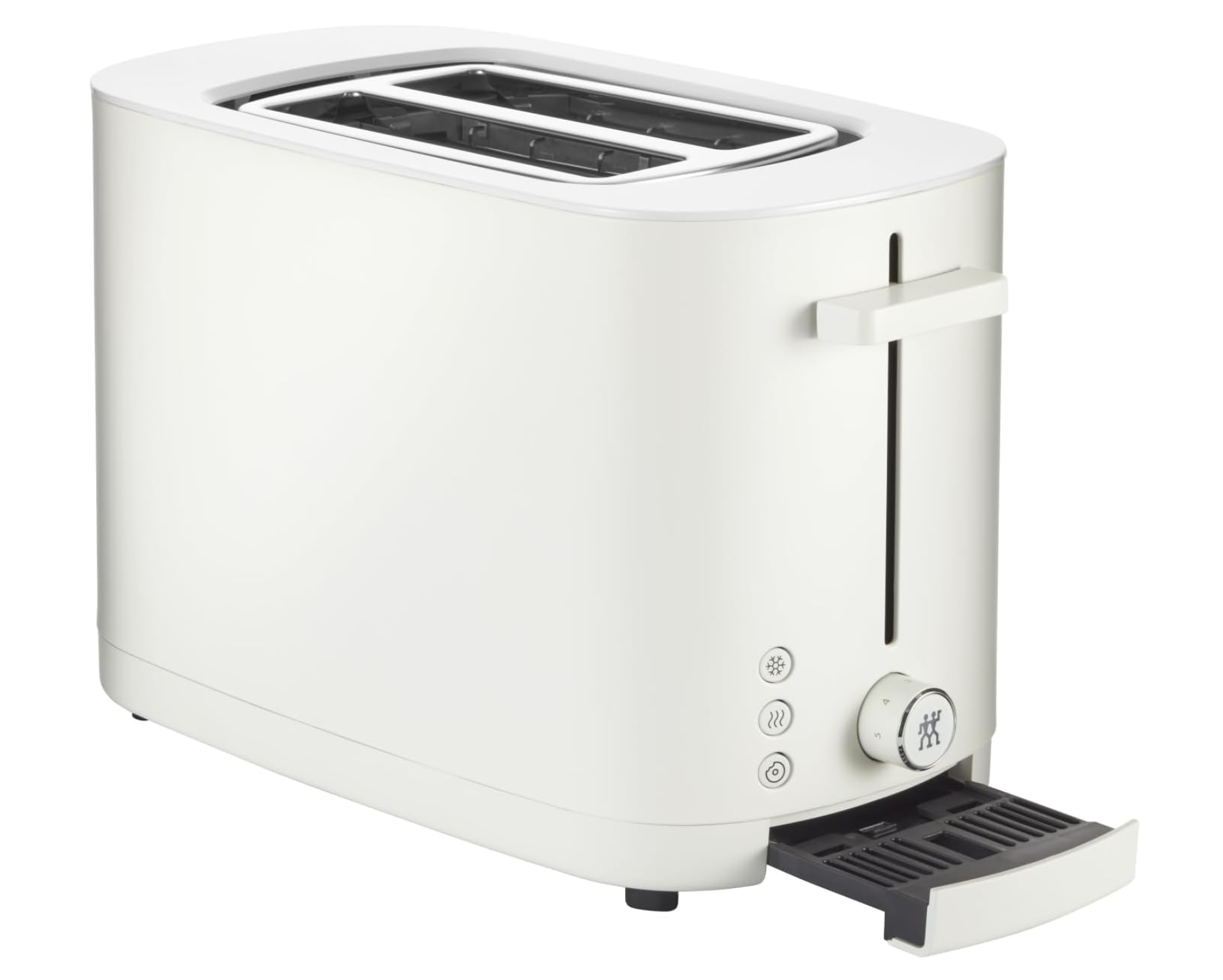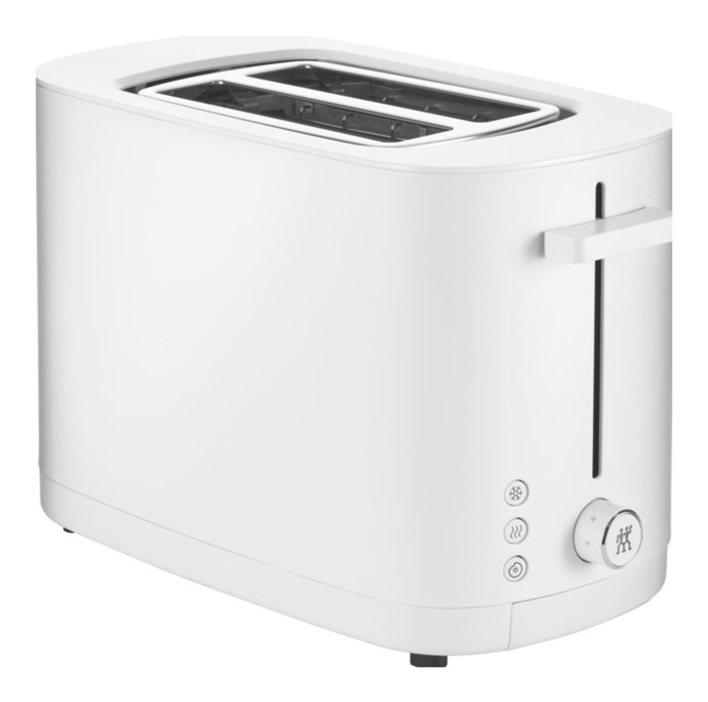Enjoy your toast precisely how you like it. Every time. The premium toaster for two slices in modern ZWILLING design always ensures evenly brown toast even over repeated toasting. It does so by automatically shortening the toasting duration to achieve the desired browning. The 1000 watt toaster's four separate heating elements evenly toast both sides of every slice. The result is crispy on the outside and soft on the inside – authentic ZWILLING toast. When it's finished, toast doesn't fly out of the toaster. The soft-lift feature ensures they gently glide up and the built-in extra-lift feature allows even smaller slices to be removed easily from the toaster. Never burn your toast again: This toaster automatically switches off when the preset toasting duration is reached. Even when set to high, toast is never toasted to more than dark brown. The stop button also allows you to instantly stop toasting at any time. Crumbs fall into the easy-to-remove crumb tray. The toaster features seven browning levels as well as three automatic programs. The warm up feature allows you to reheat cold toast. The thaw feature allows you to toast frozen bread direct from the freezer. And the bagel feature with slice centring allows you to achieve ideal bagel toasting results: crispy on the outside, toasted on the inside.